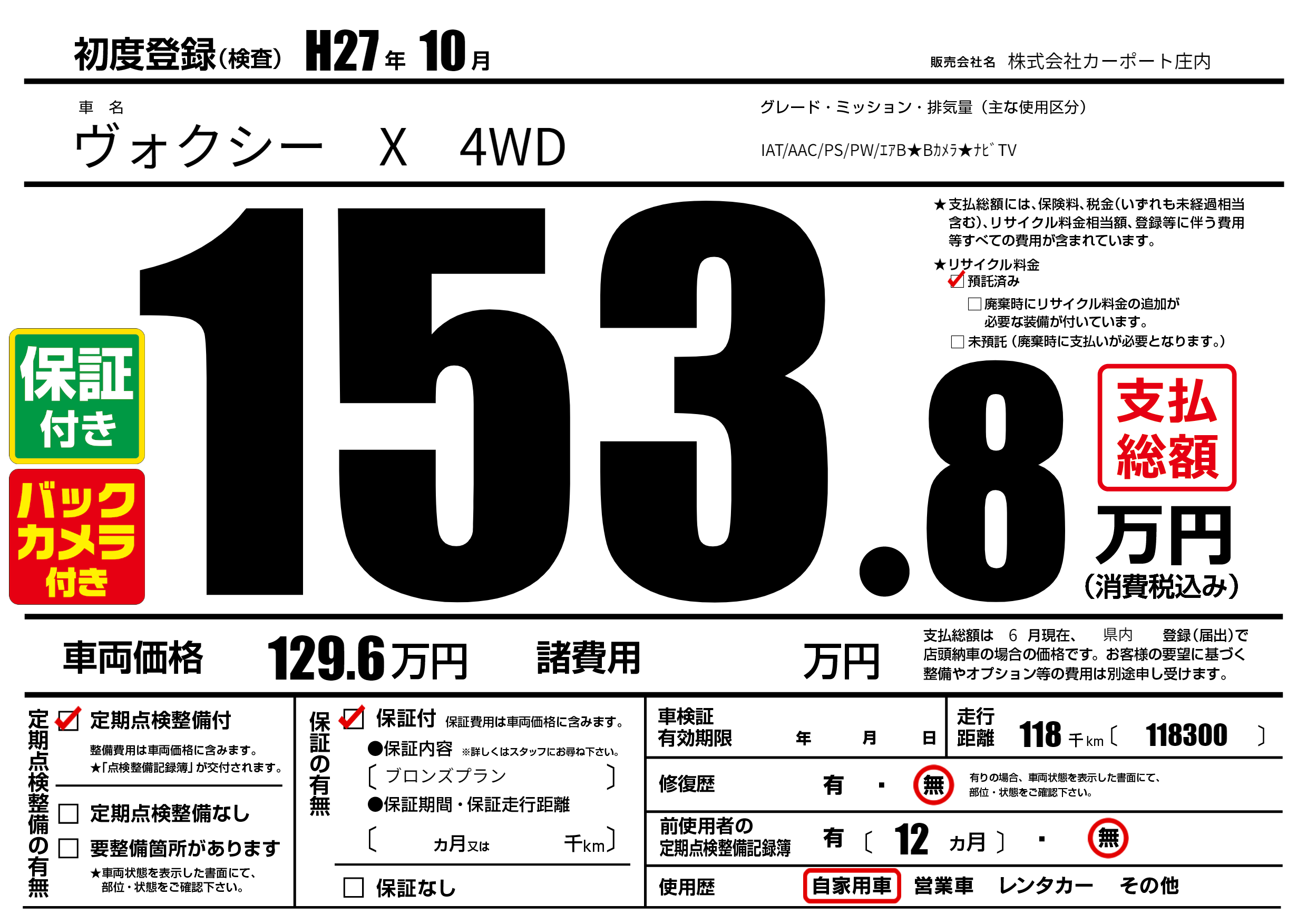 | 車名 | ヴォクシー X 4WD | グレード ミッション 排気量 |