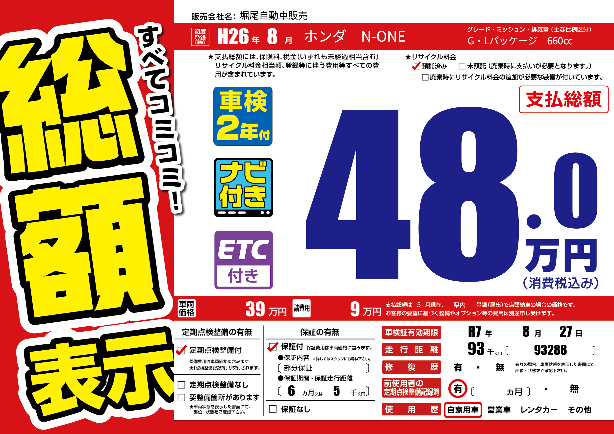 | 走行キロ | 9.3万km | 初年度登録 | H26年8月 |