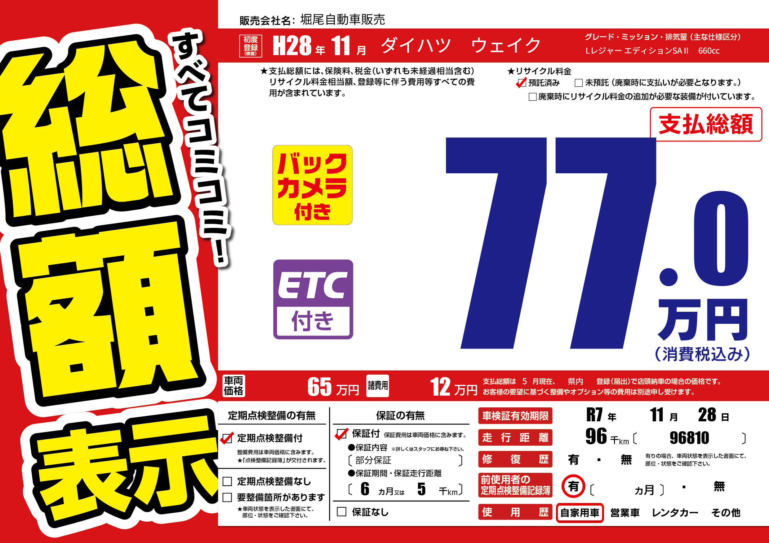 | 走行キロ | 9.6万km | 初年度登録 | H28年11月 |