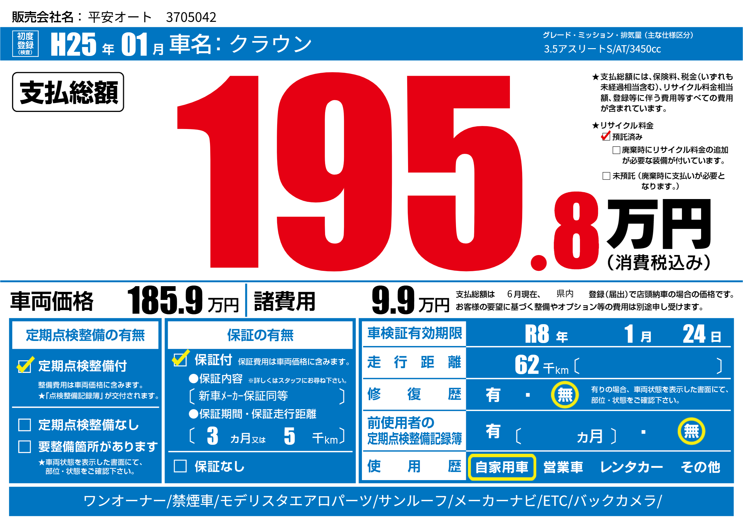 | 車名 | クラウン | グレード ミッション 排気量 |
