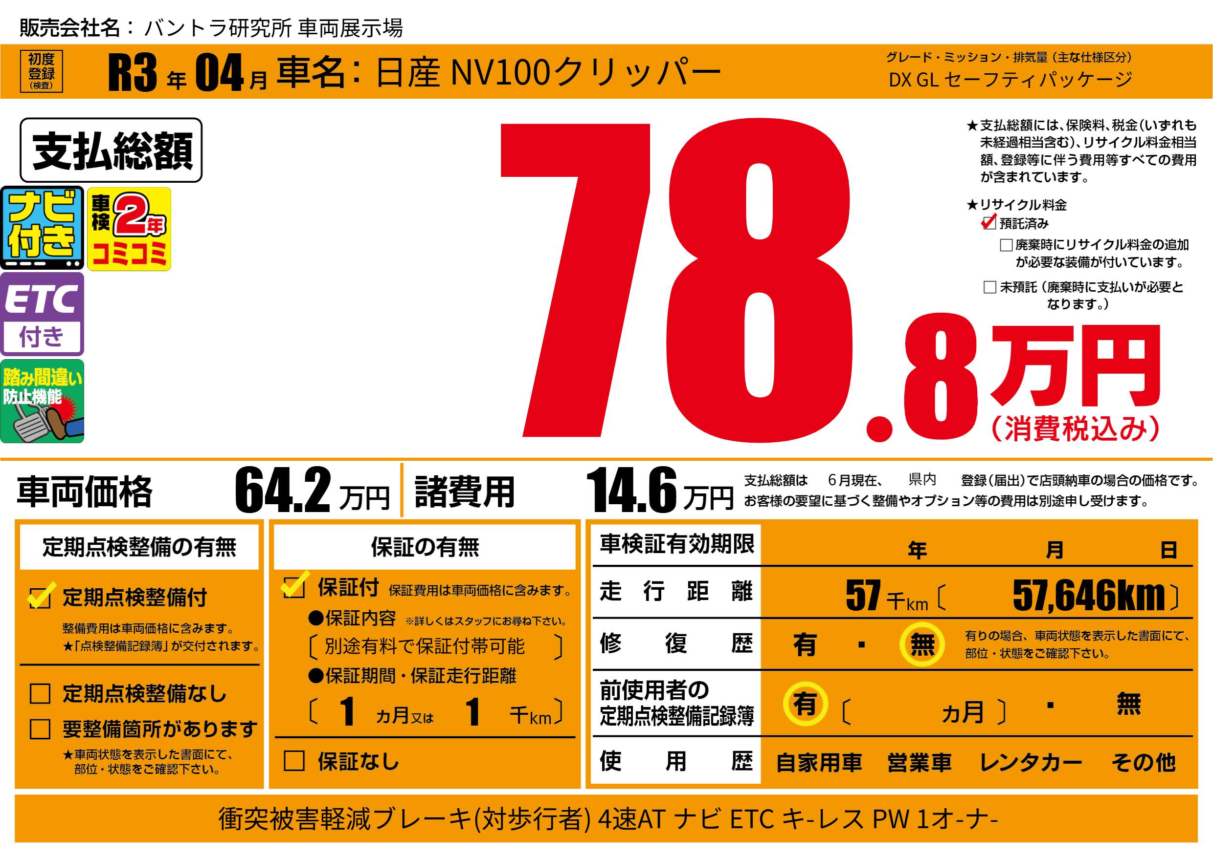 | 車名 | 日産 NV100クリッパー | グレード ミッション 排気量 |