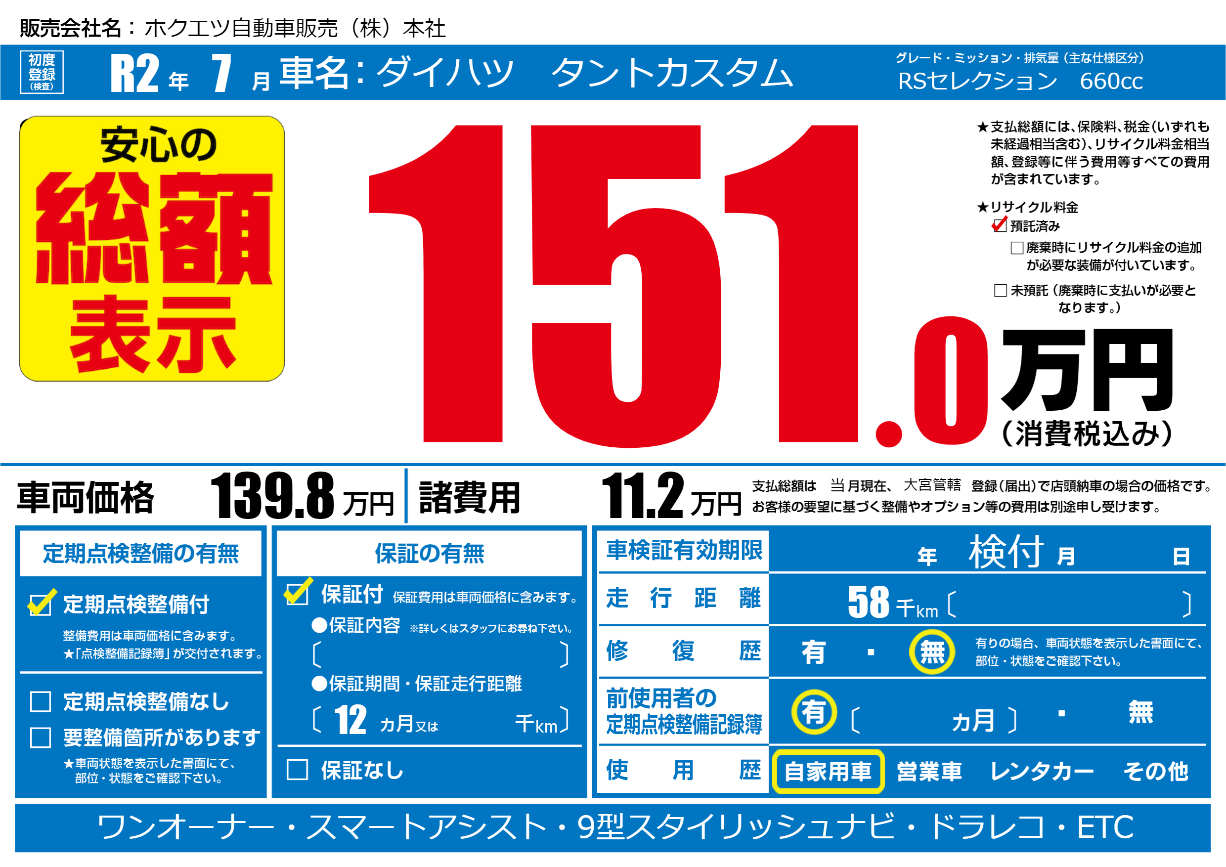 | 走行キロ | 5.8万km | 初年度登録 | R2年7月 |