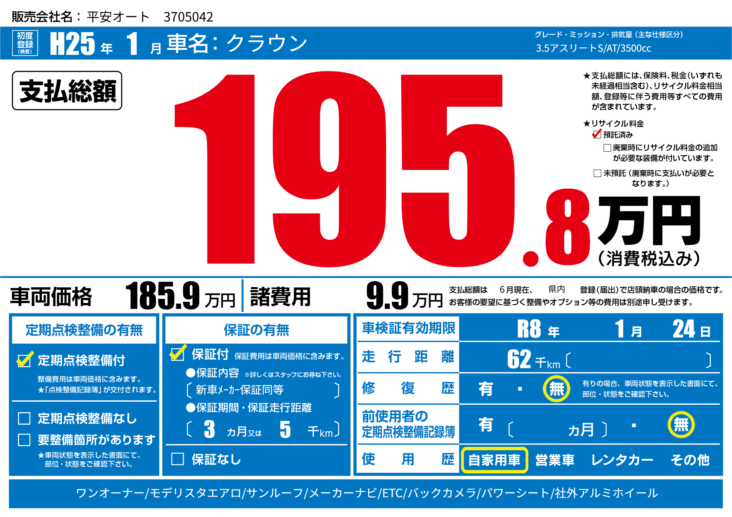 | 車名 | クラウン | グレード ミッション 排気量 |