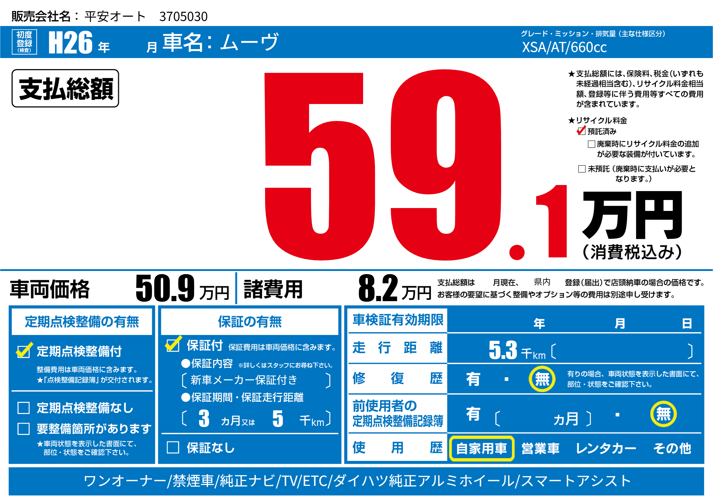 保証付き 保証内容(新車メーカー保証付き) 3ヶ月または5千km |