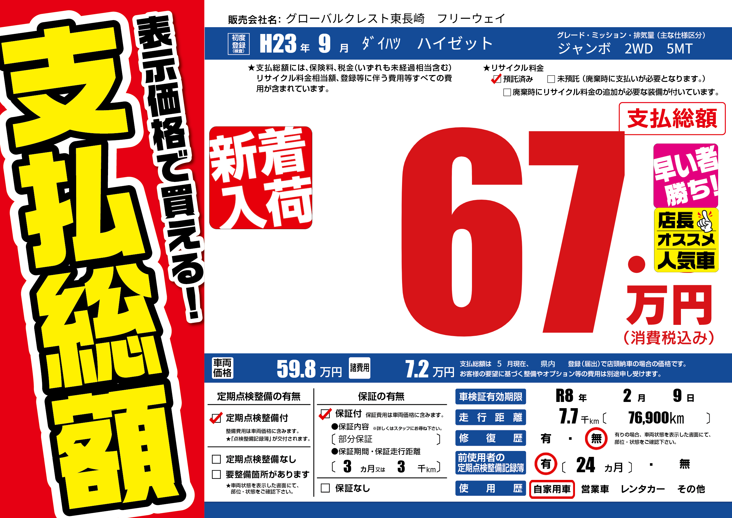 | 車名 | ダイハツ ハイゼット | グレード ミッション 排気量 |