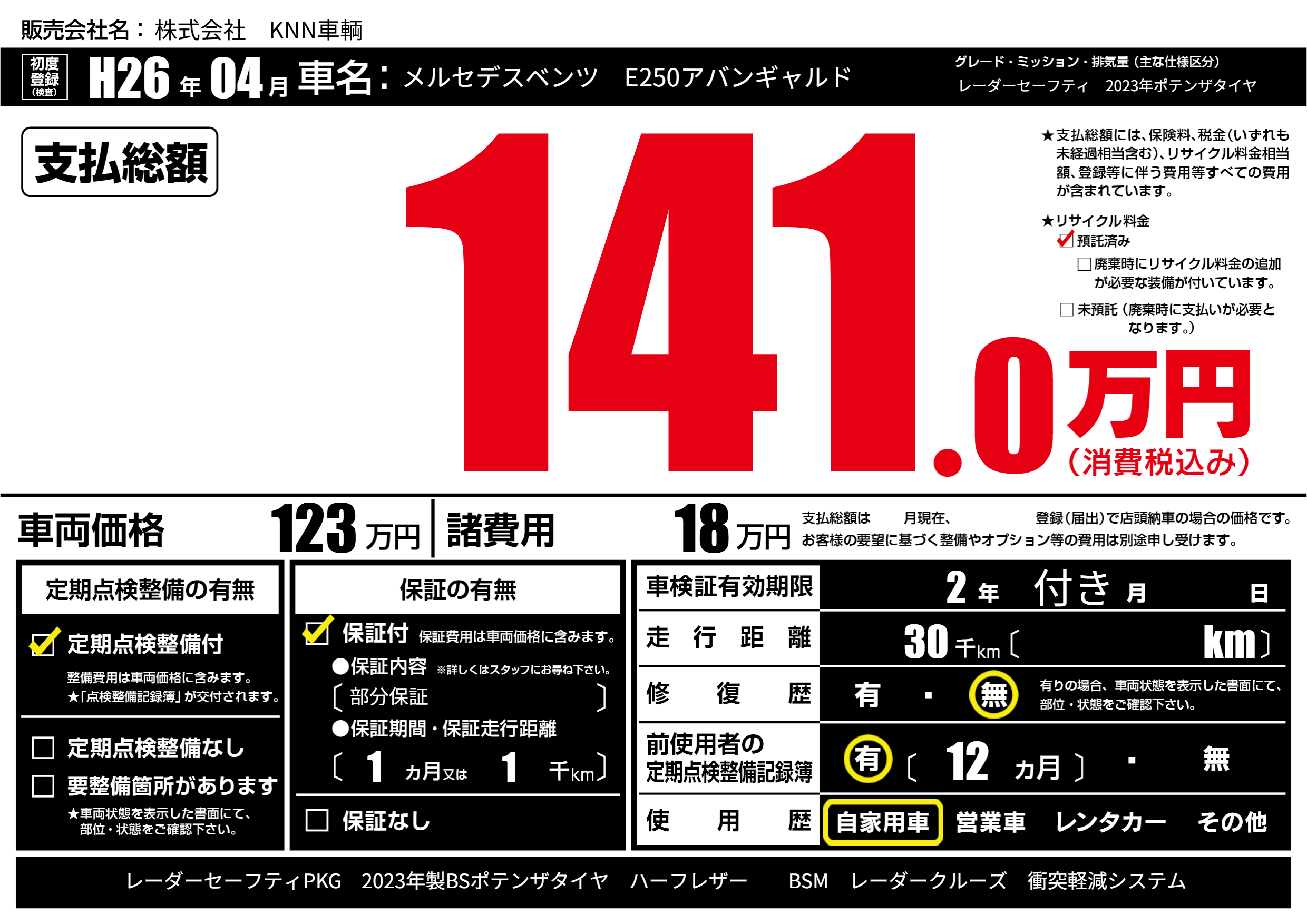 | 車名 | メルセデスベンツ E250アバンギャルド | グレード ミッション 排気量 |