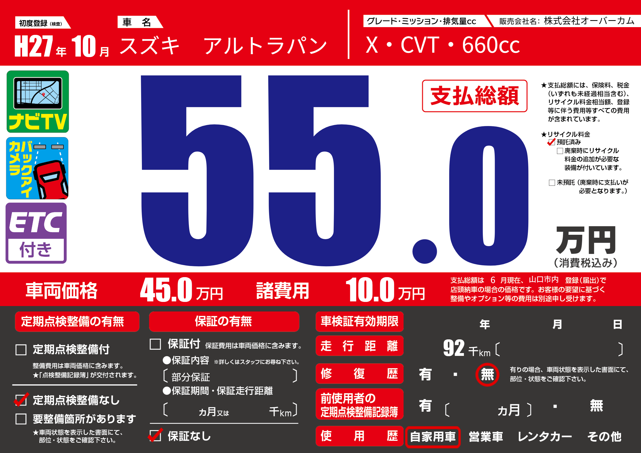 | 走行キロ | 9.2万km | 初年度登録 | H27年10月 |