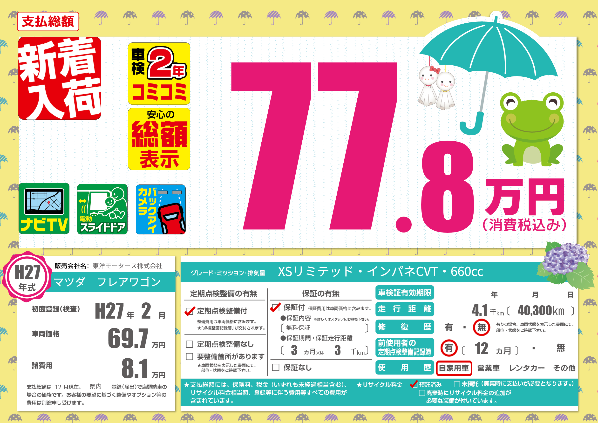 | 車名 | マツダ フレアワゴン | グレード ミッション 排気量 |