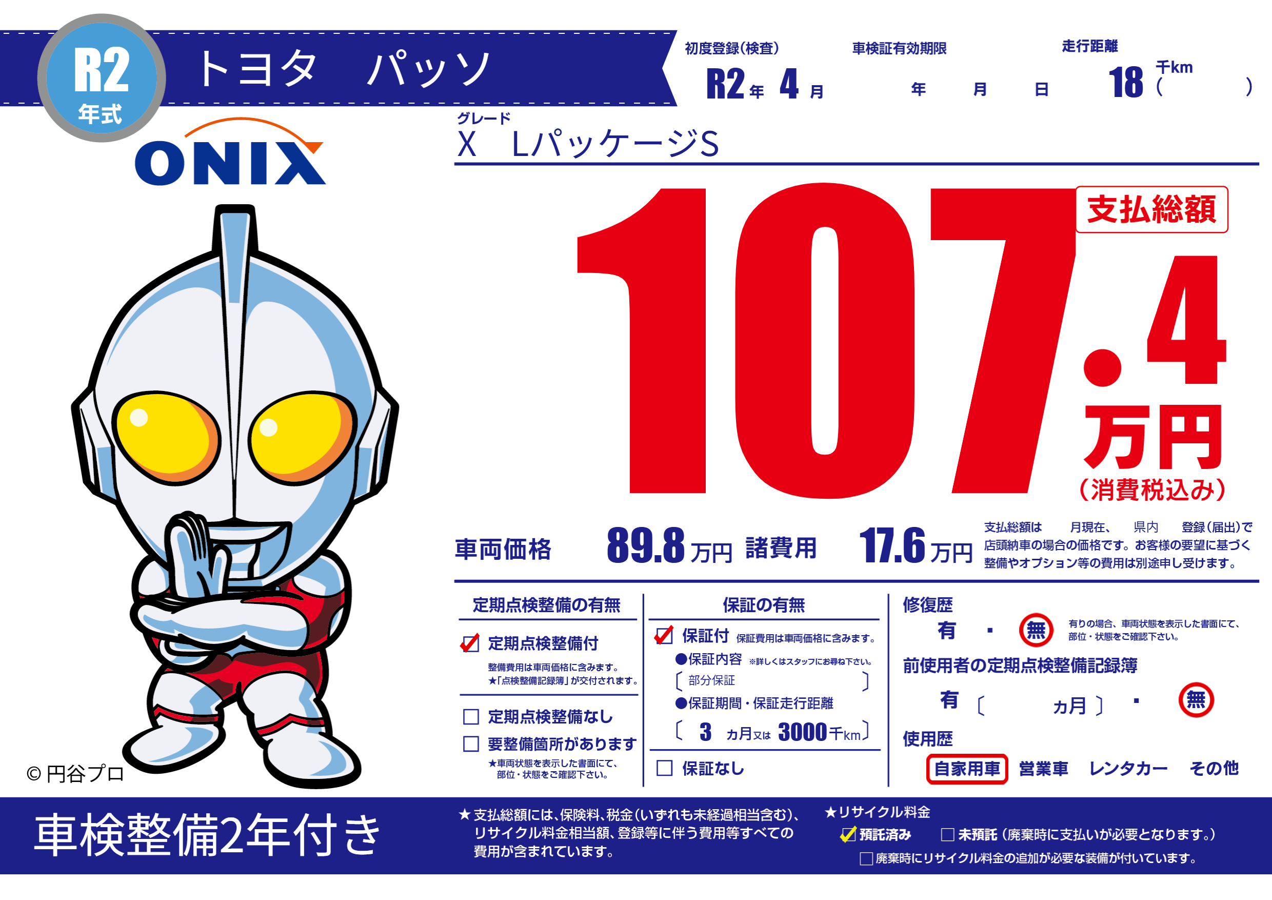 | 車名 | トヨタ パッソ | グレード ミッション 排気量 |