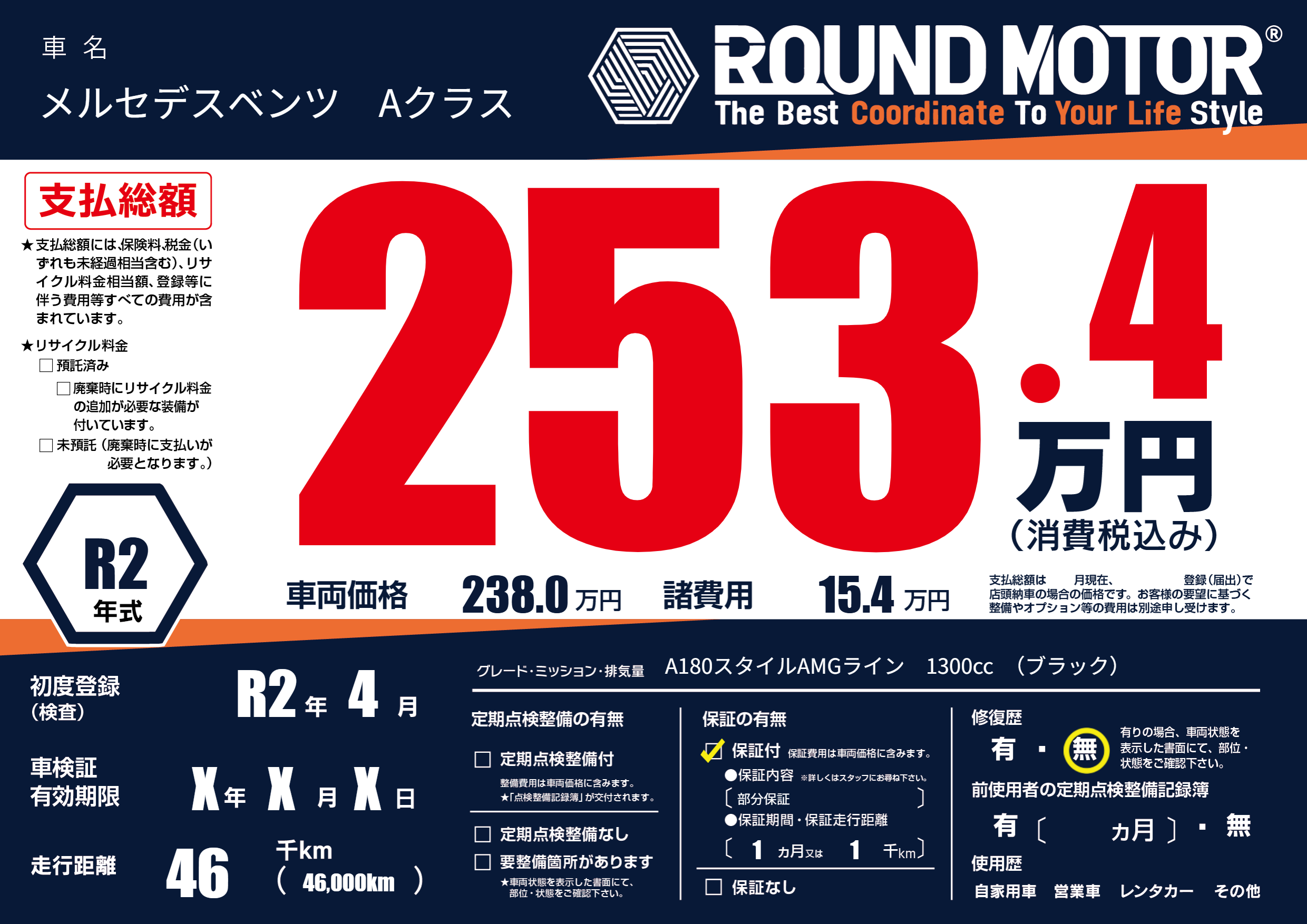 | 車名 | メルセデスベンツ Aクラス | グレード ミッション 排気量 |