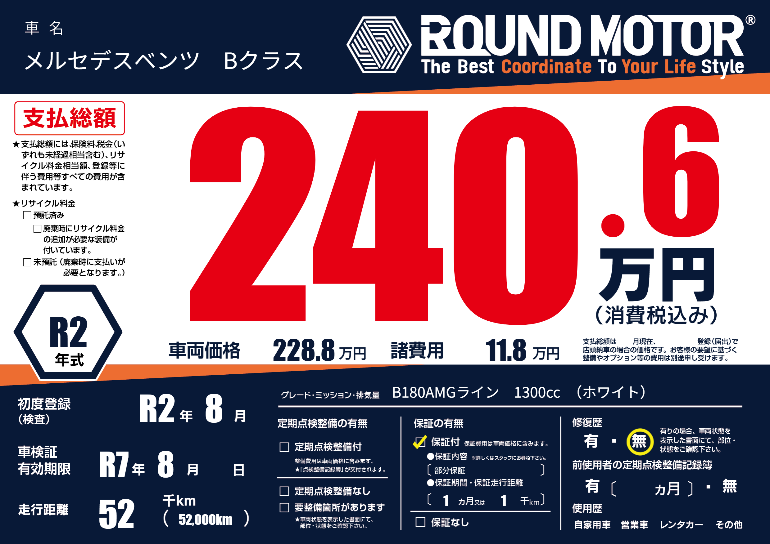 | 車名 | メルセデスベンツ Bクラス | グレード ミッション 排気量 |