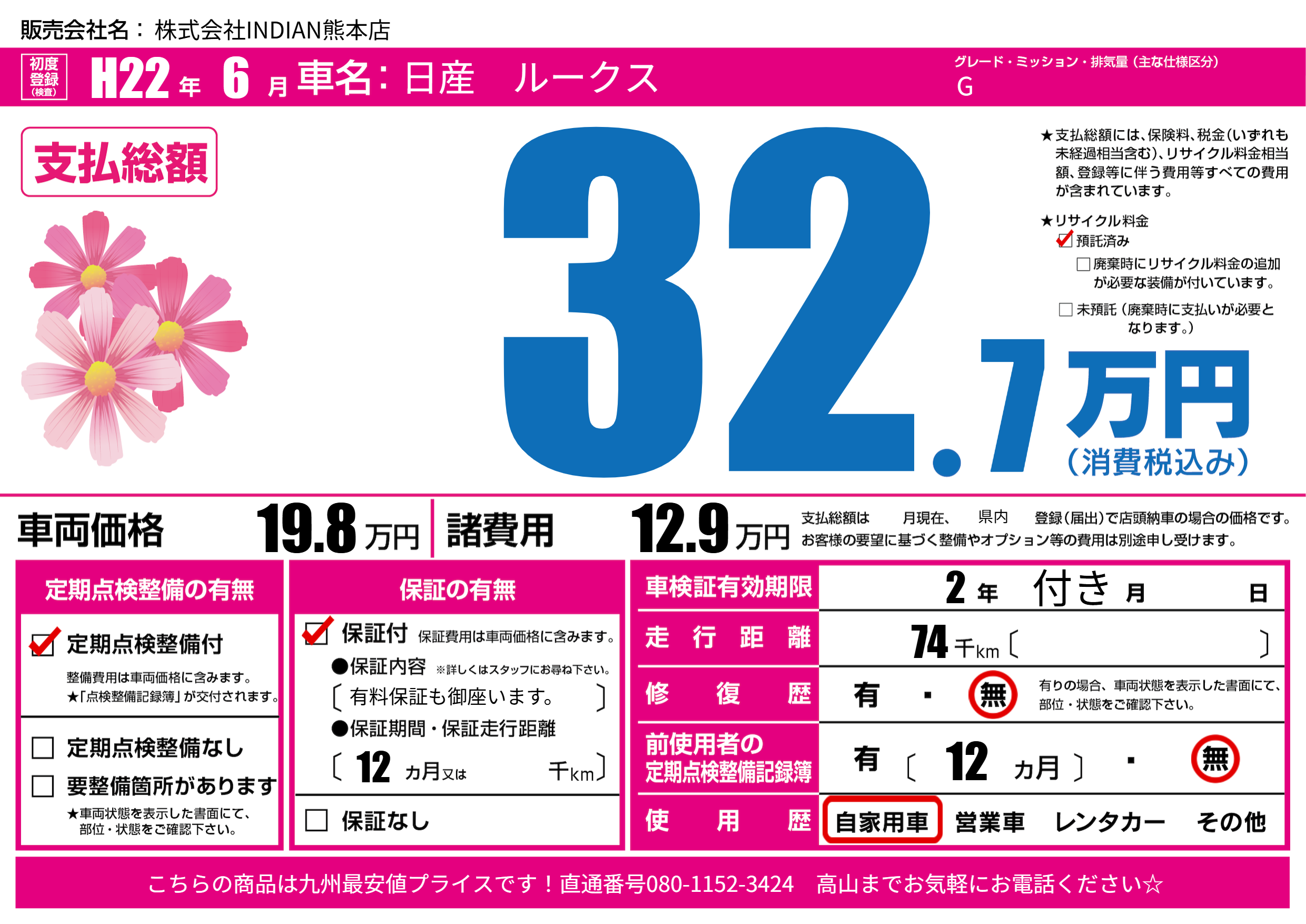 | 走行キロ | 7.4万km | 初年度登録 | H22年6月 |