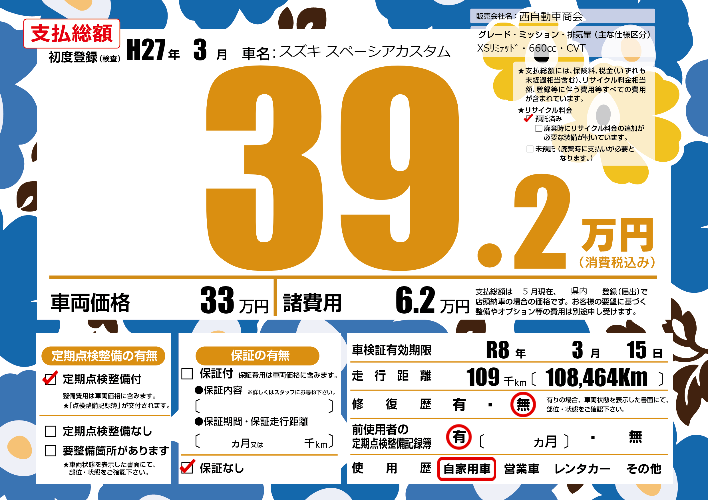 | 走行キロ | 10.9万km | 初年度登録 | H27年3月 |