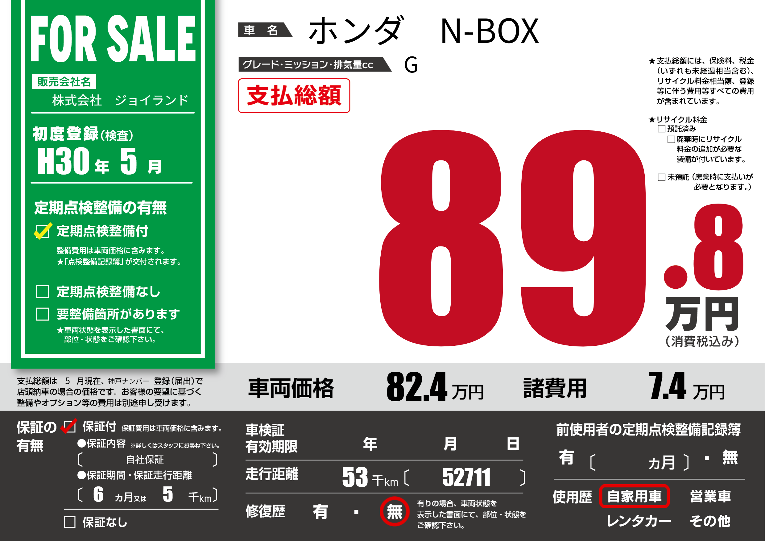 | 車名 | ホンダ N-BOX | グレード ミッション 排気量 |