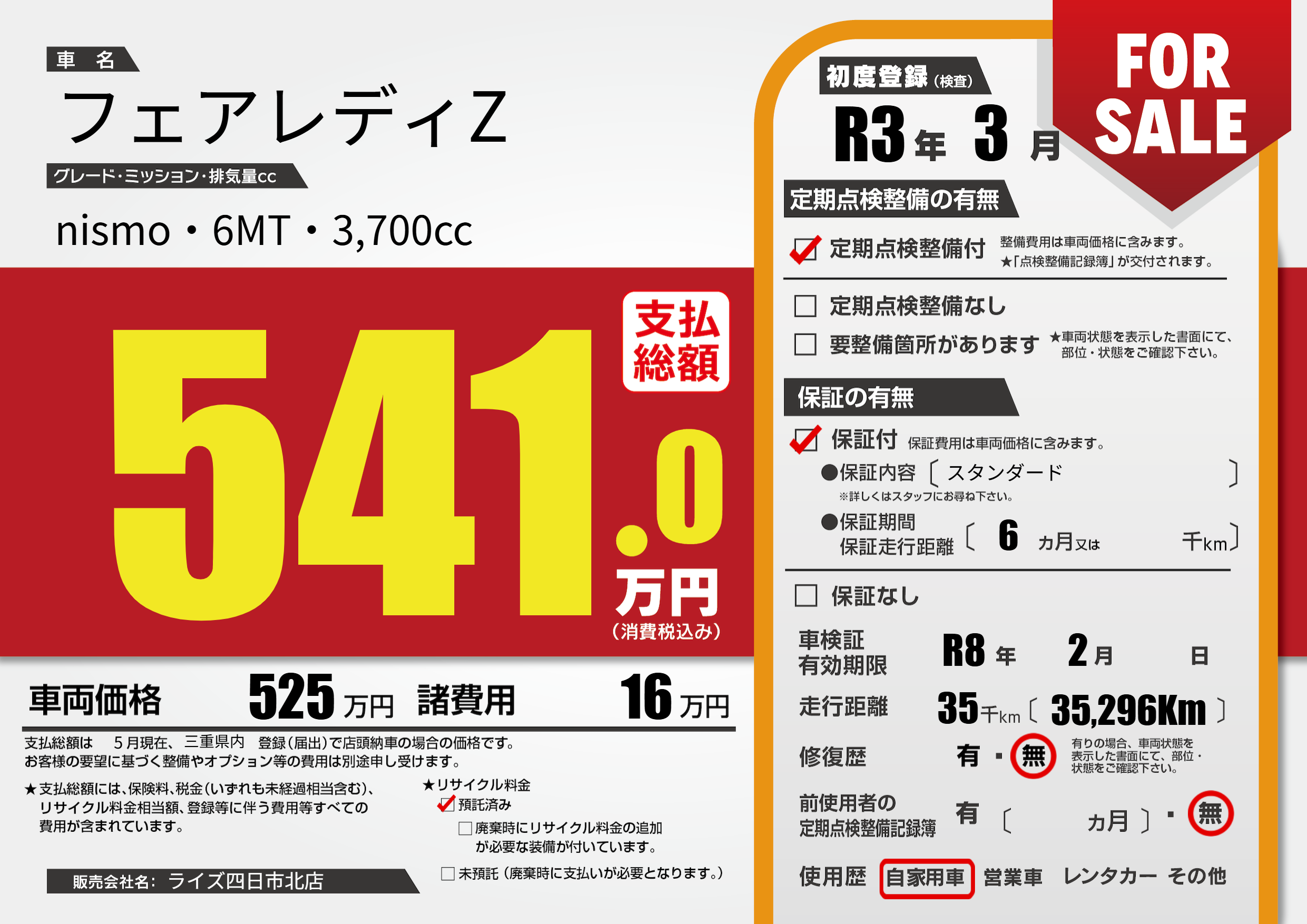 | 車名 | フェアレディZ | グレード ミッション 排気量 |