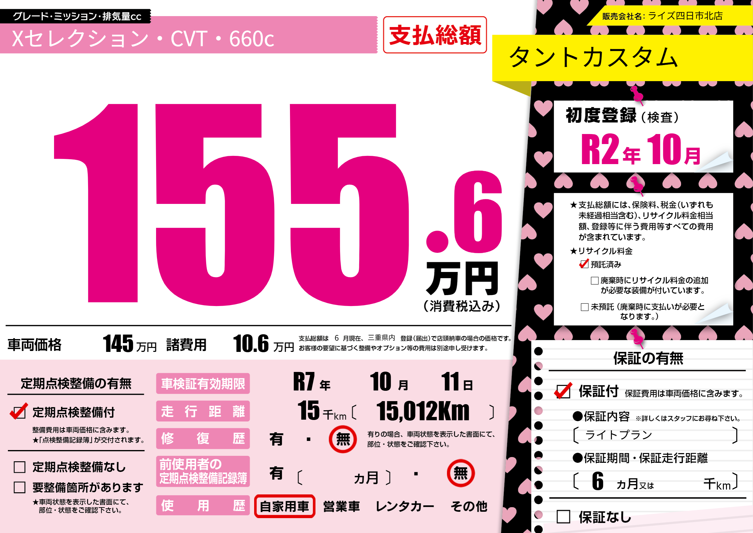 | 車名 | タントカスタム | グレード ミッション 排気量 |