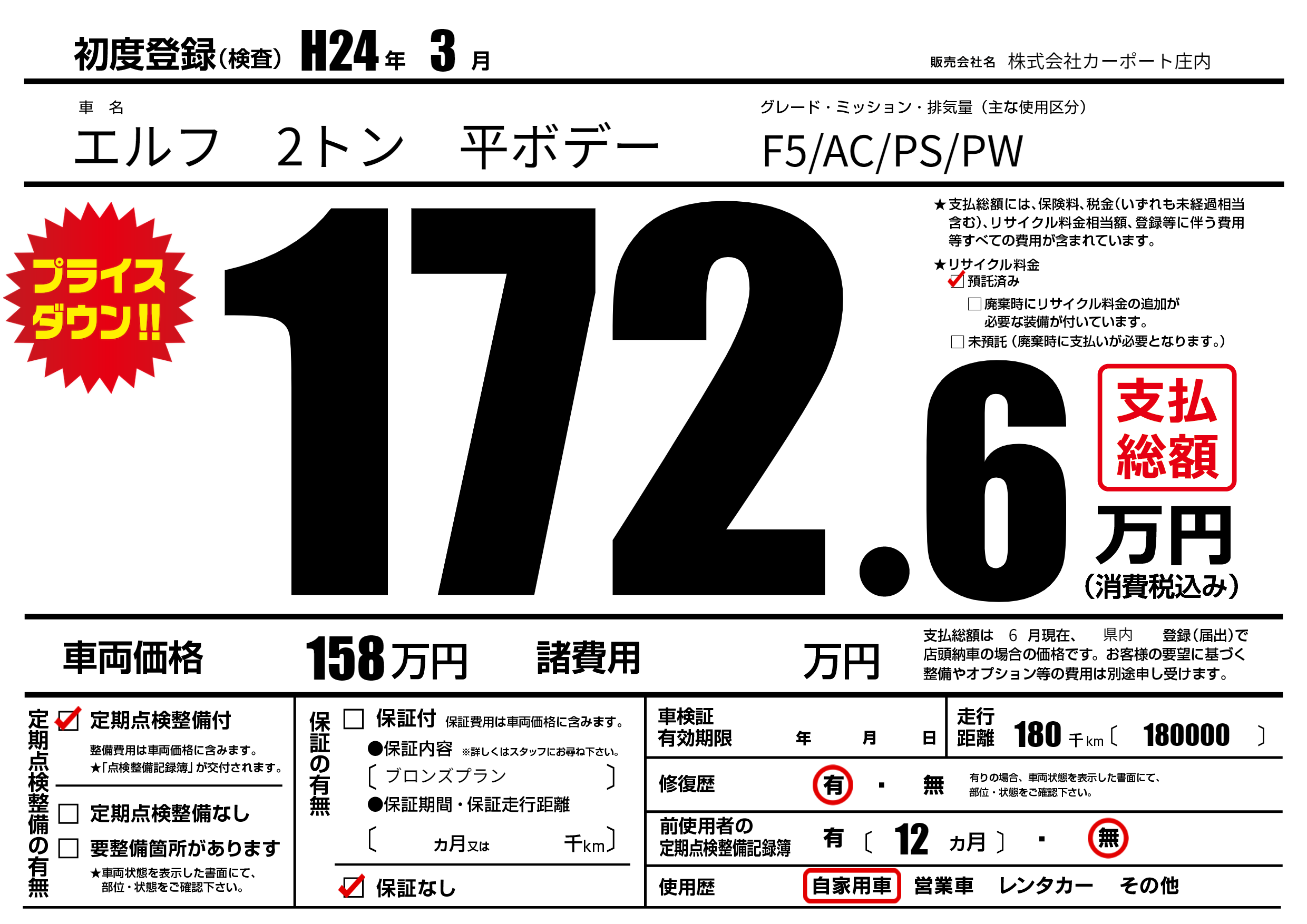 | 走行キロ | 18万km | 初年度登録 | H24年3月 |