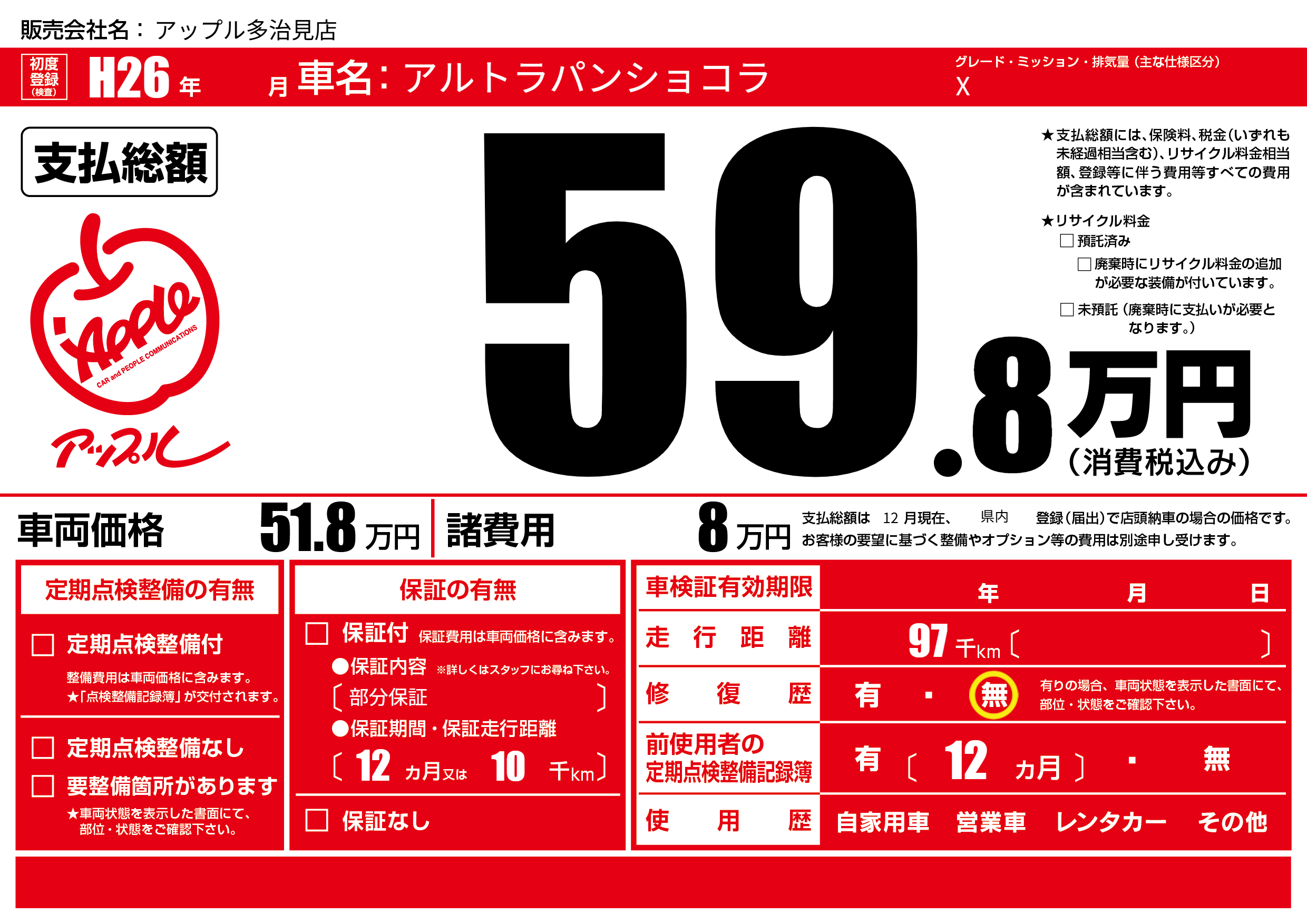 | 走行キロ | 9.7万km | 初年度登録 | H26年---月 |