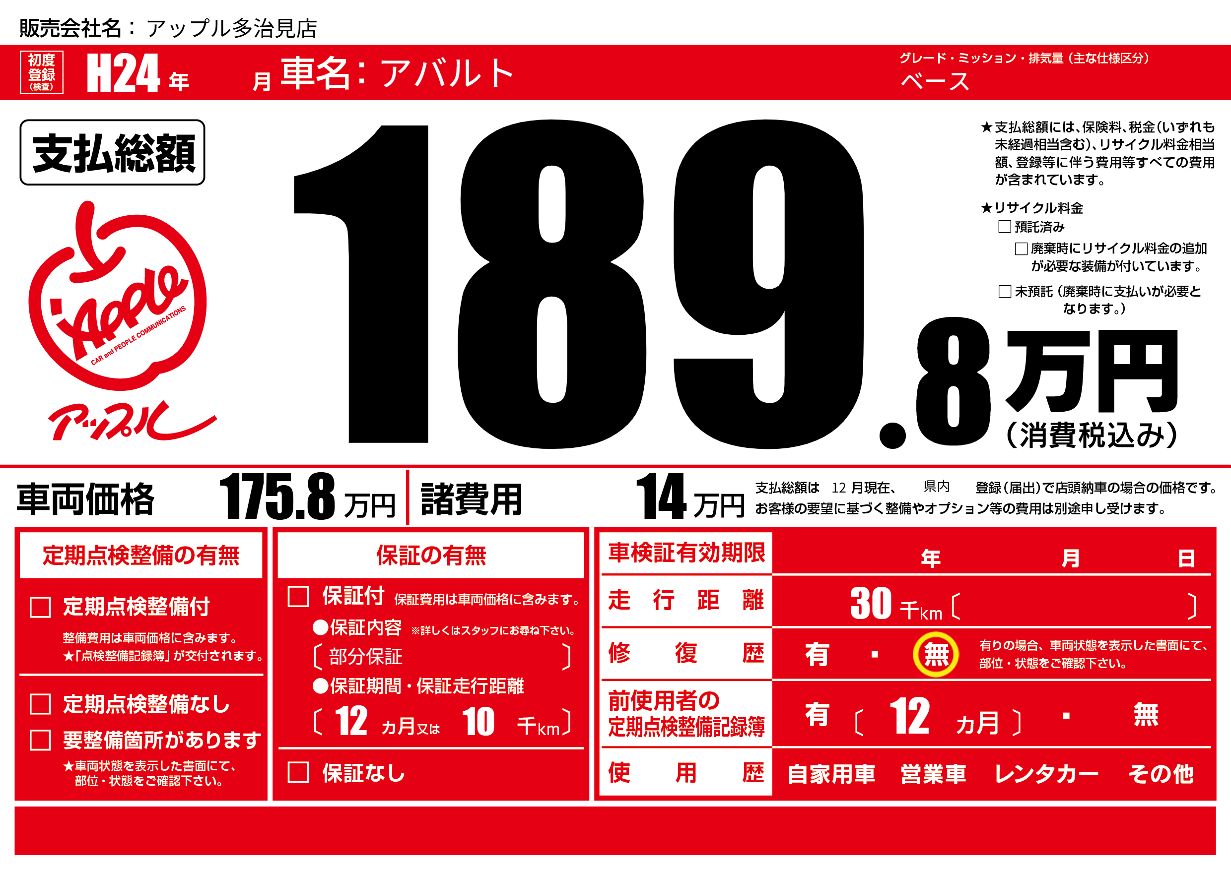 | 走行キロ | 3万km | 初年度登録 | H24年---月 |