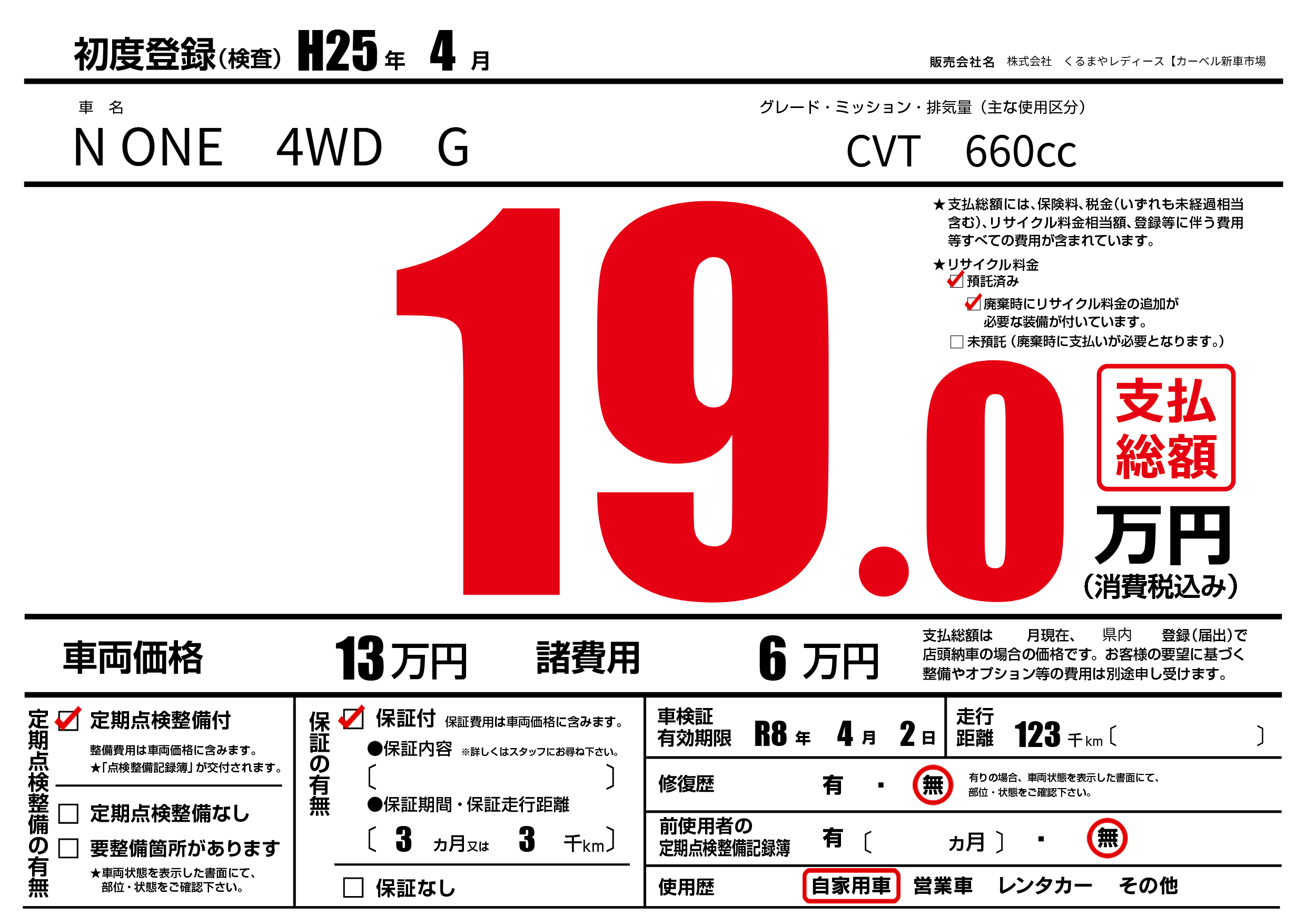 | 車名 | N ONE 4WD G | グレード ミッション 排気量 |