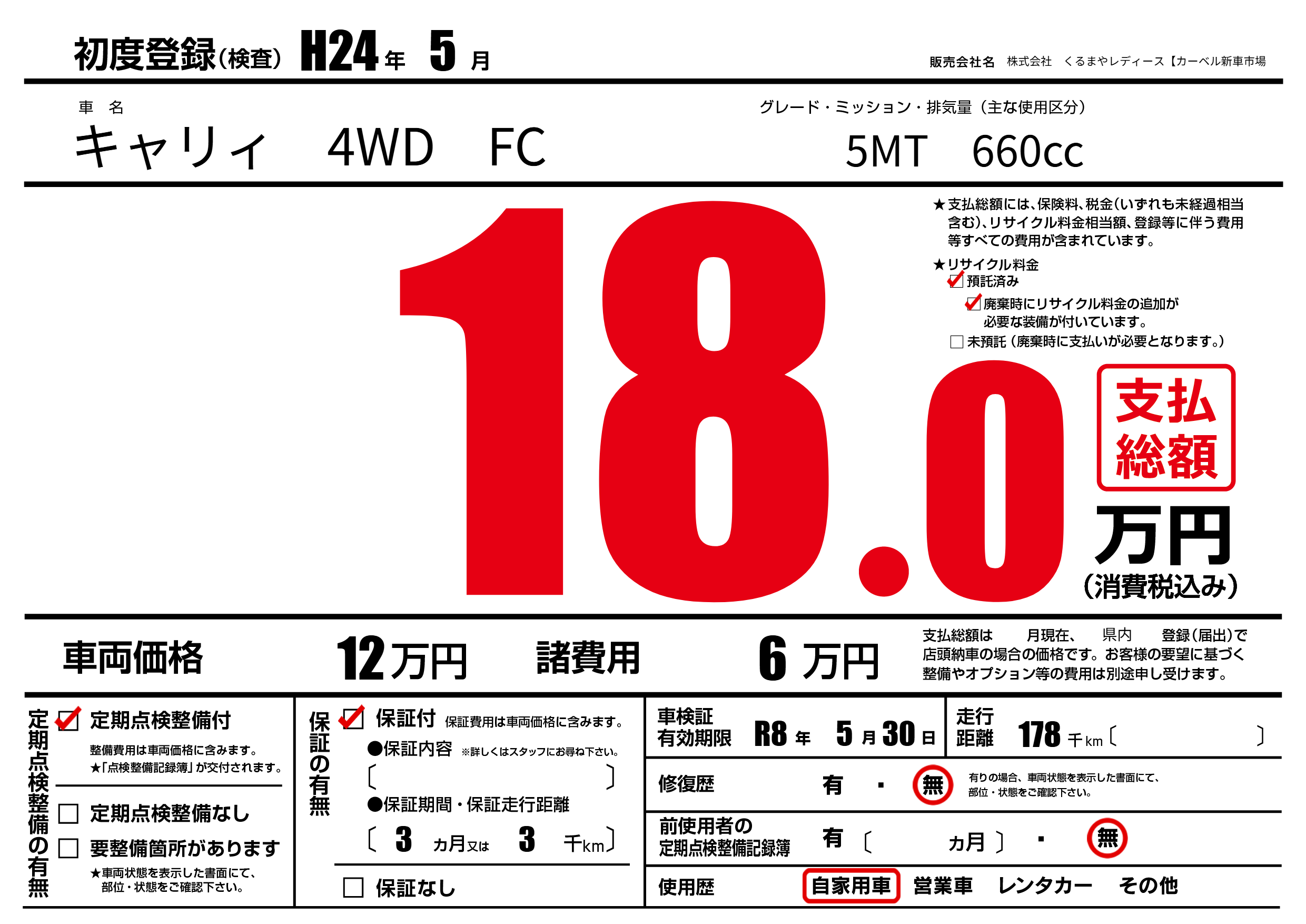 | 走行キロ | 17.8万km | 初年度登録 | H24年5月 |