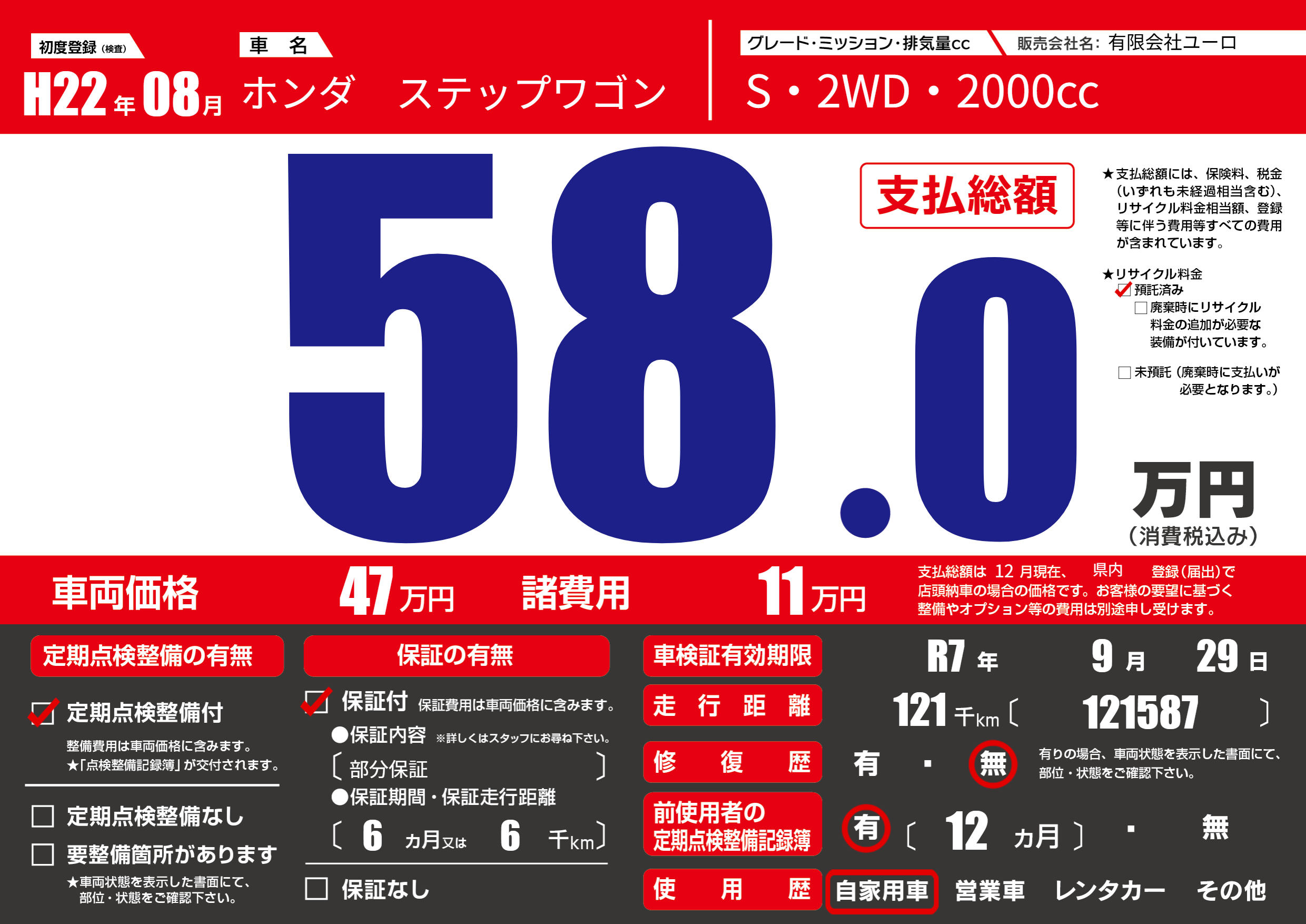 | 走行キロ | 12.1万km | 初年度登録 | H22年08月 |