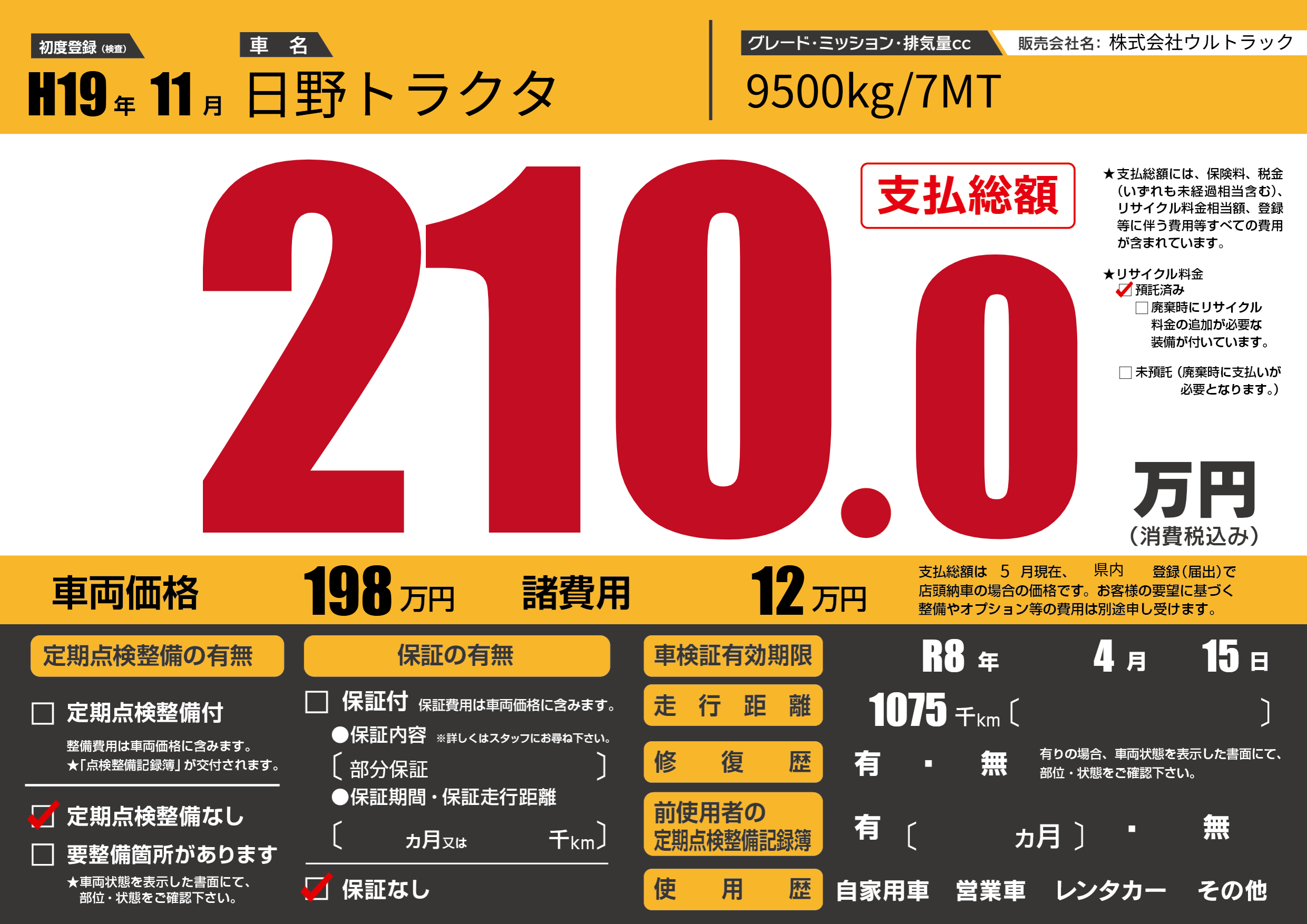 | 走行キロ | 107.5万km | 初年度登録 | H19年11月 |