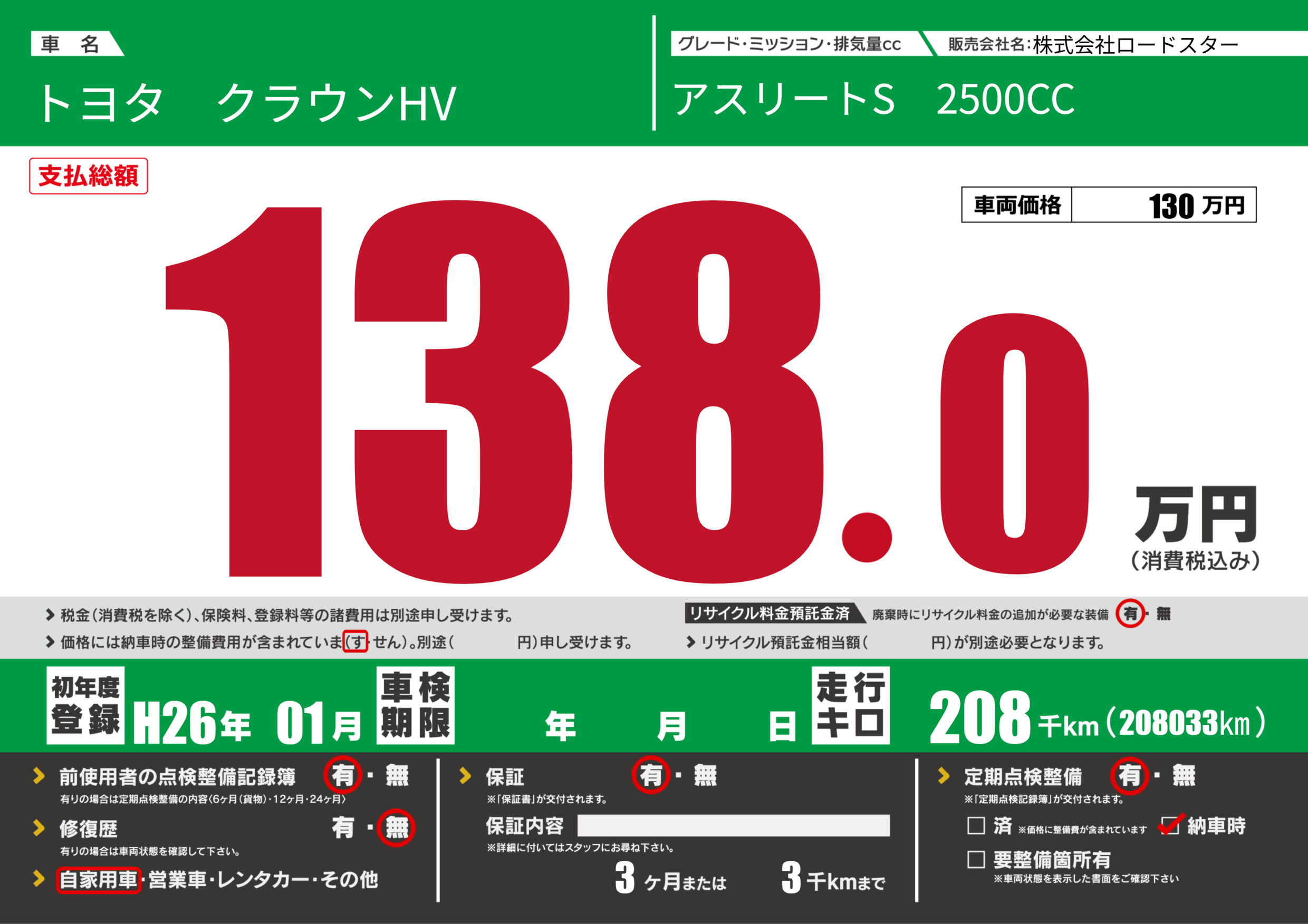 | 走行キロ | 20.8万km | 初年度登録 | H26年01月 |