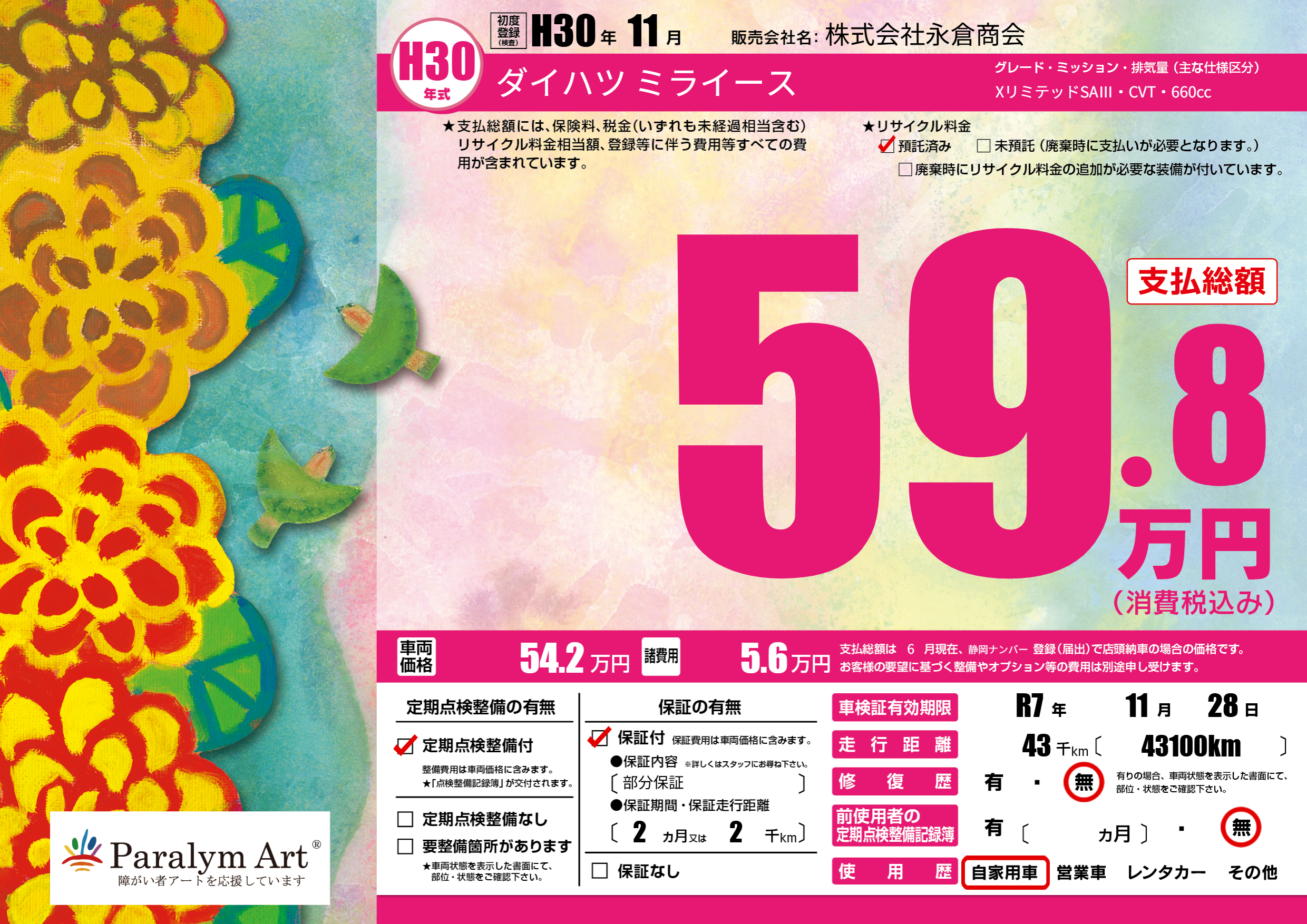 | 走行キロ | 4.3万km | 初年度登録 | H30年11月 |
