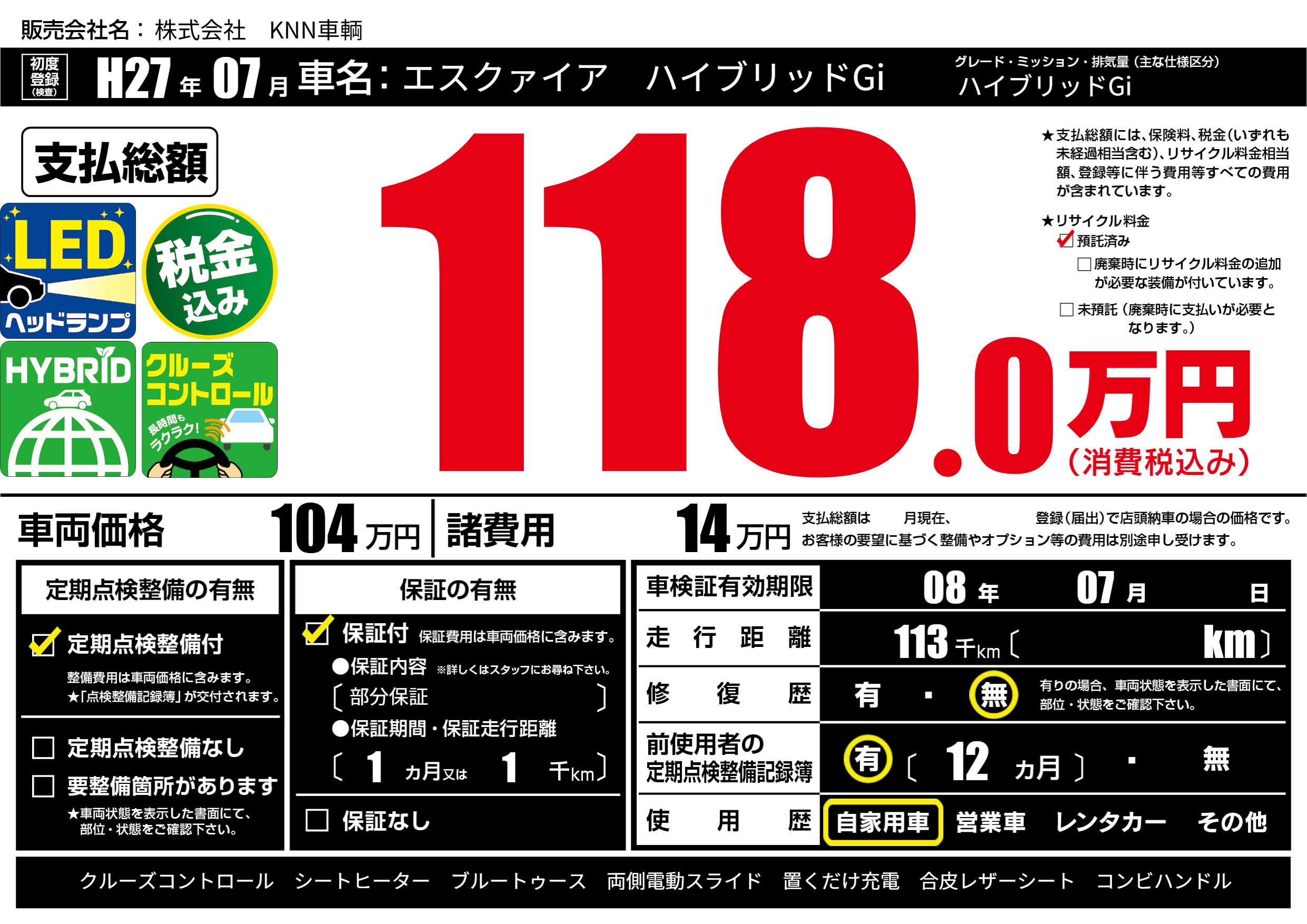 | 車名 | エスクァイア ハイブリッドGi | グレード ミッション 排気量 |