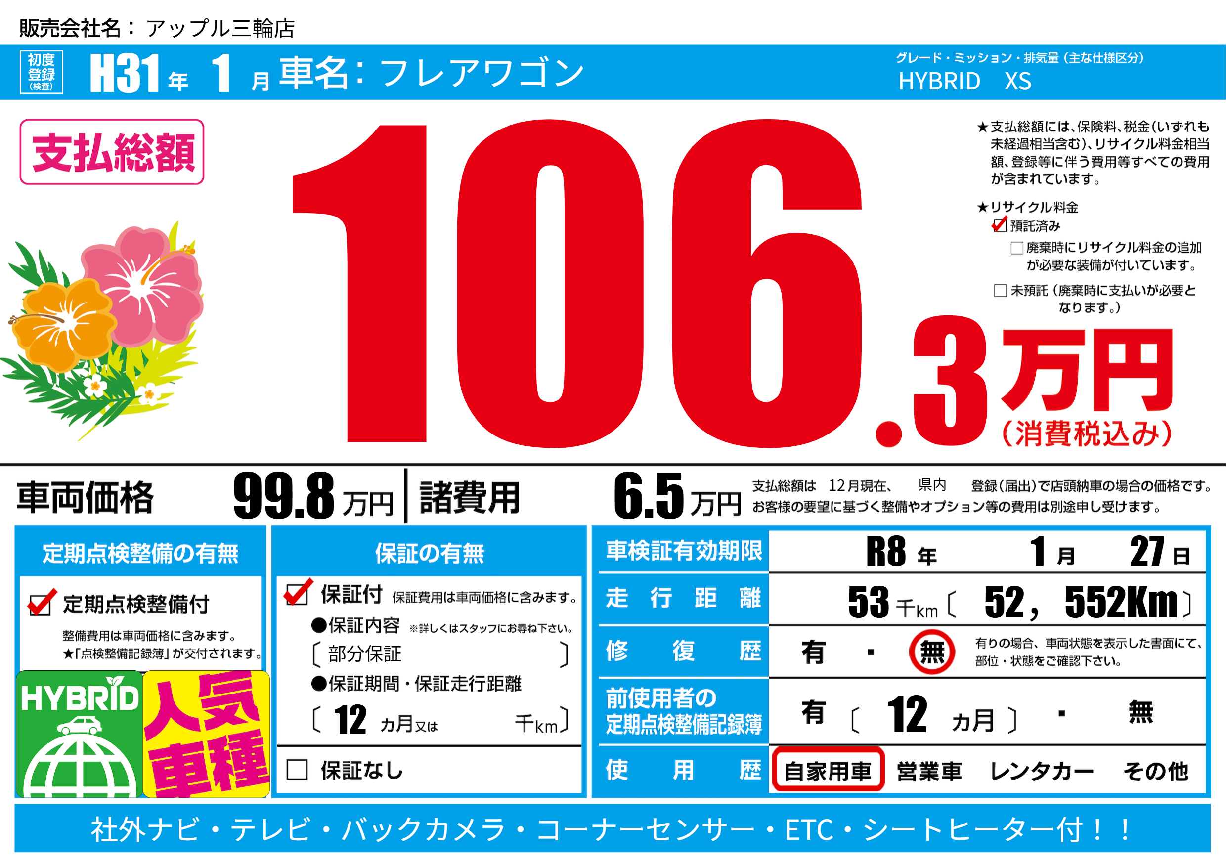 | 車検制限 | R8年 1月 27日 | ||