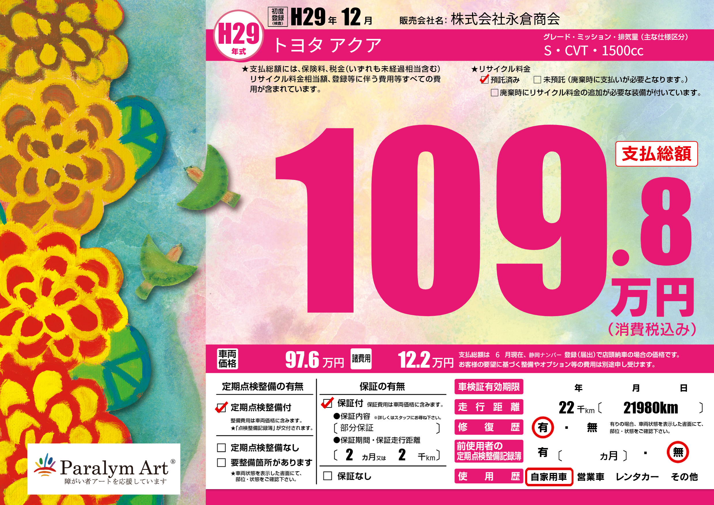 | 車名 | トヨタ アクア | グレード ミッション 排気量 |