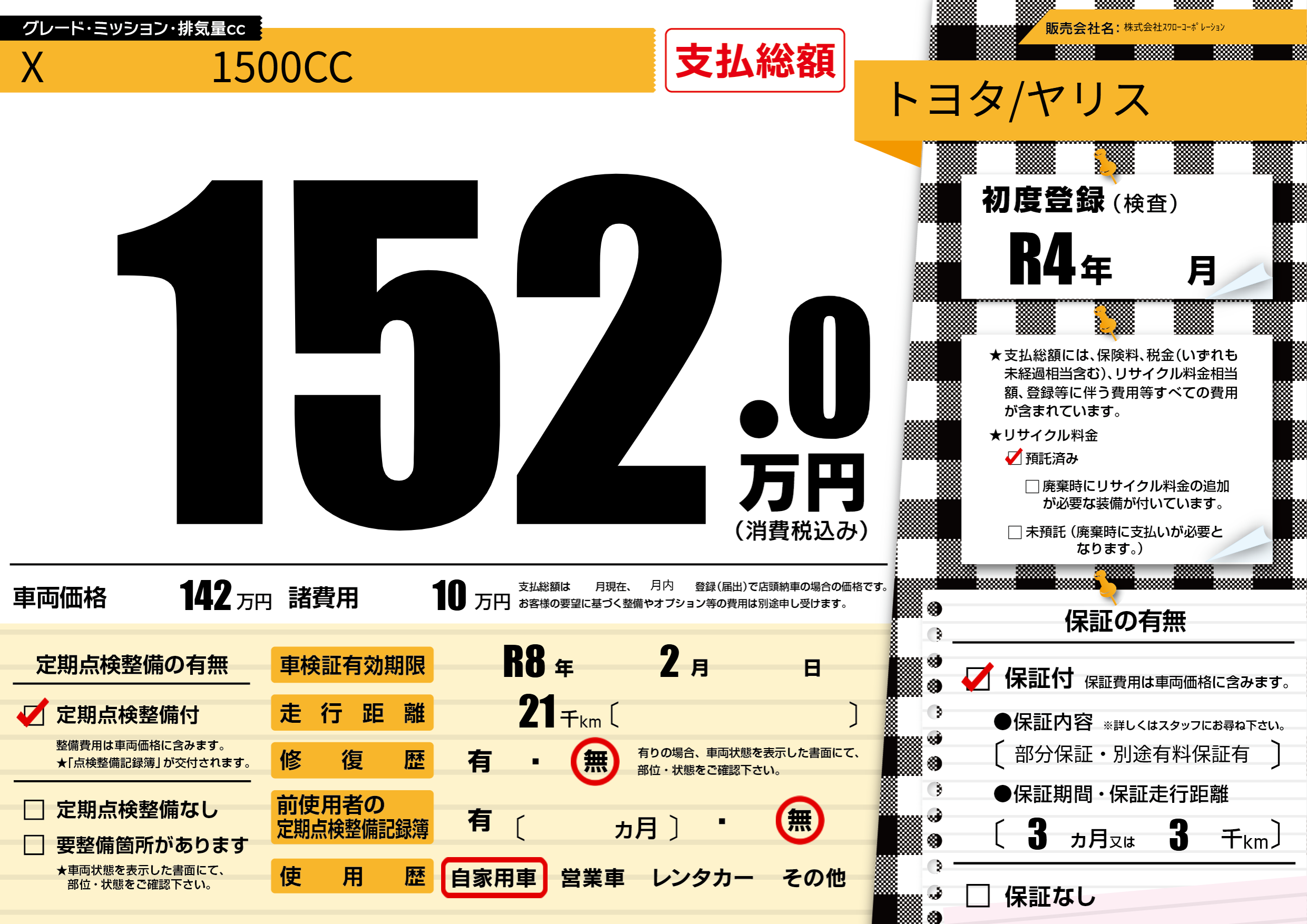 | 車名 | トヨタ/ヤリス | グレード ミッション 排気量 |