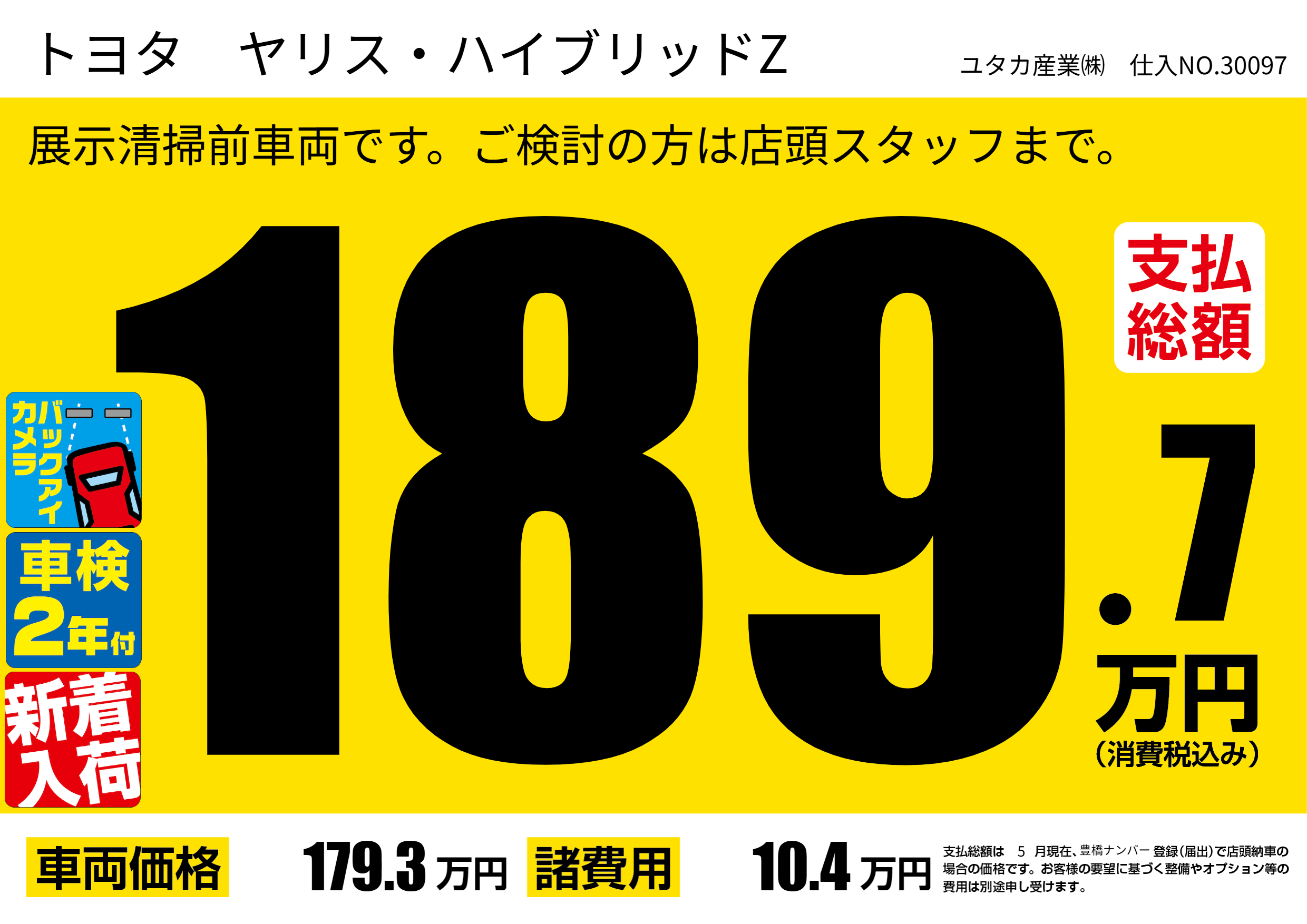 | 車名 | トヨタ ヤリス・ハイブリッドZ | グレード ミッション 排気量 |
