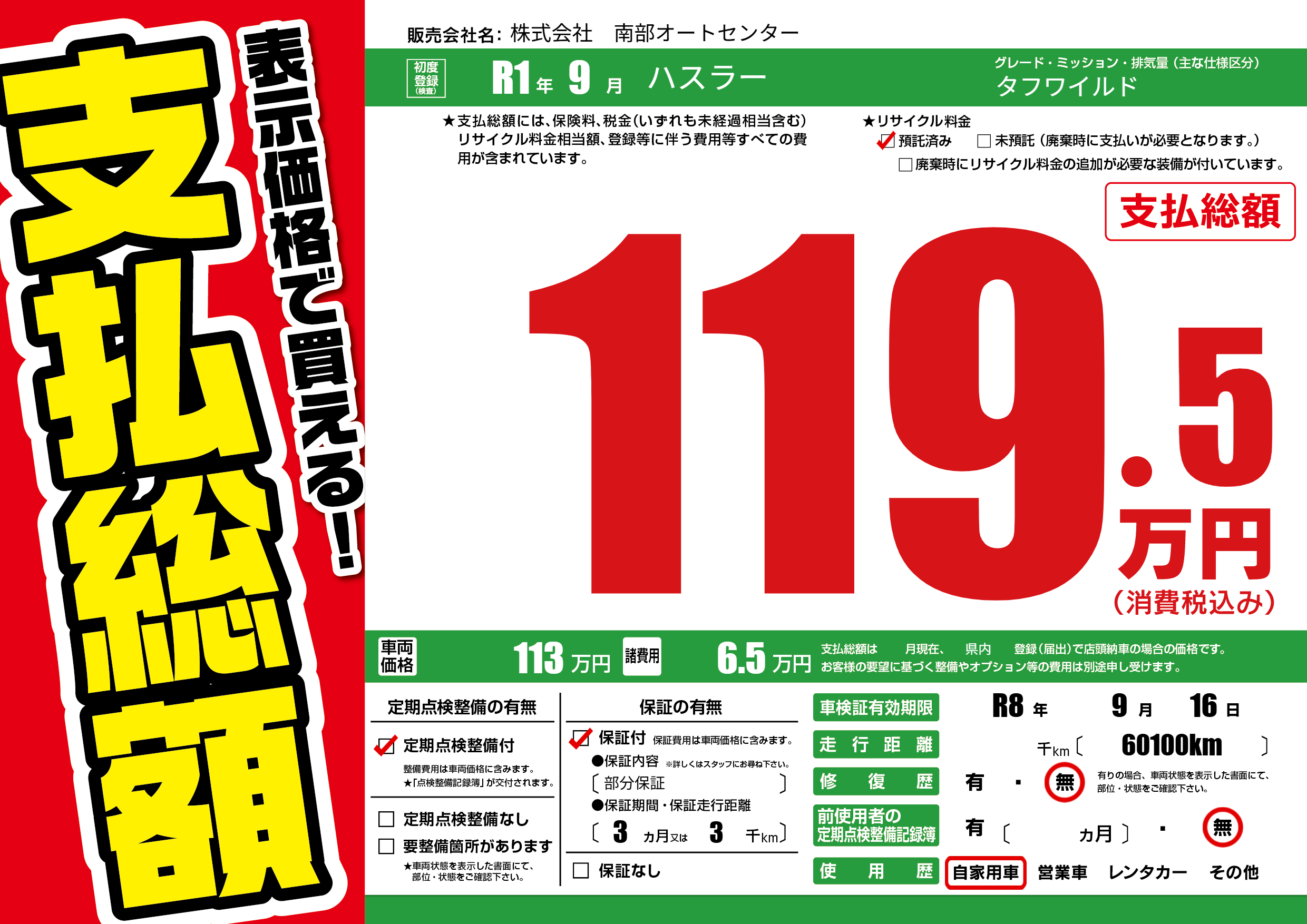 | 車名 | ハスラー | グレード ミッション 排気量 |