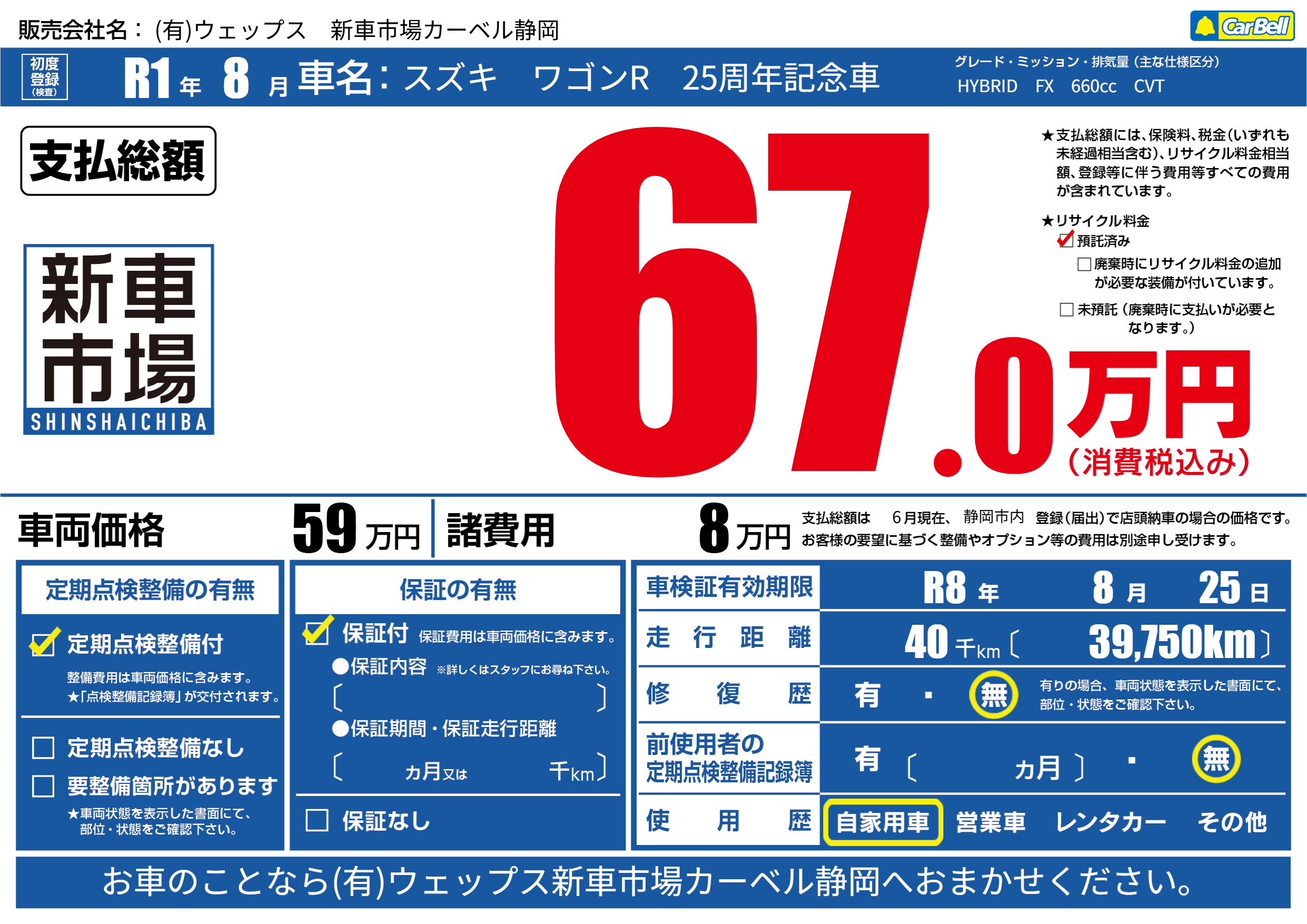 | 車名 | スズキ ワゴンR 25周年記念車 | グレード ミッション 排気量 |