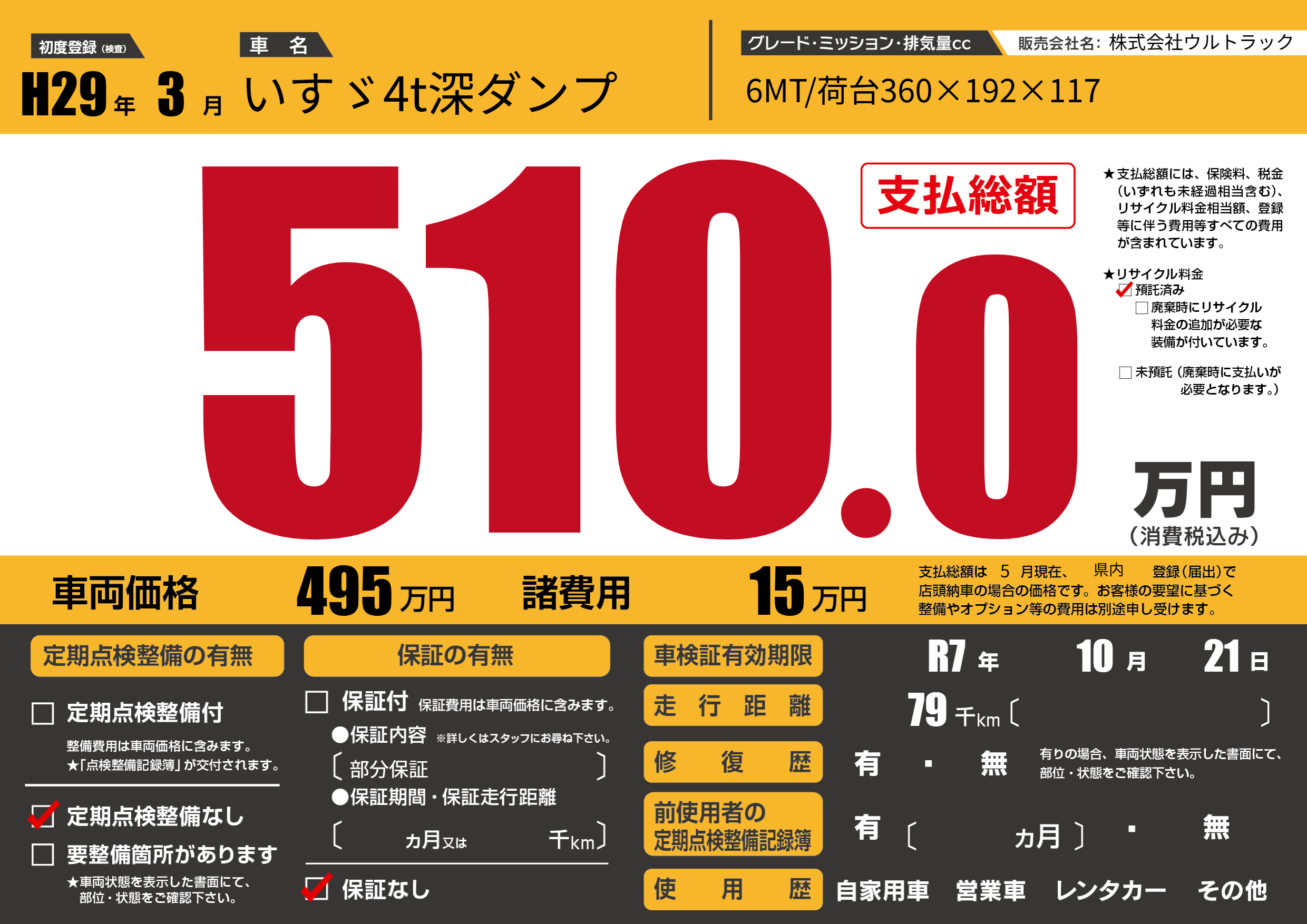 | 車名 | いすゞ4t深ダンプ | グレード ミッション 排気量 |