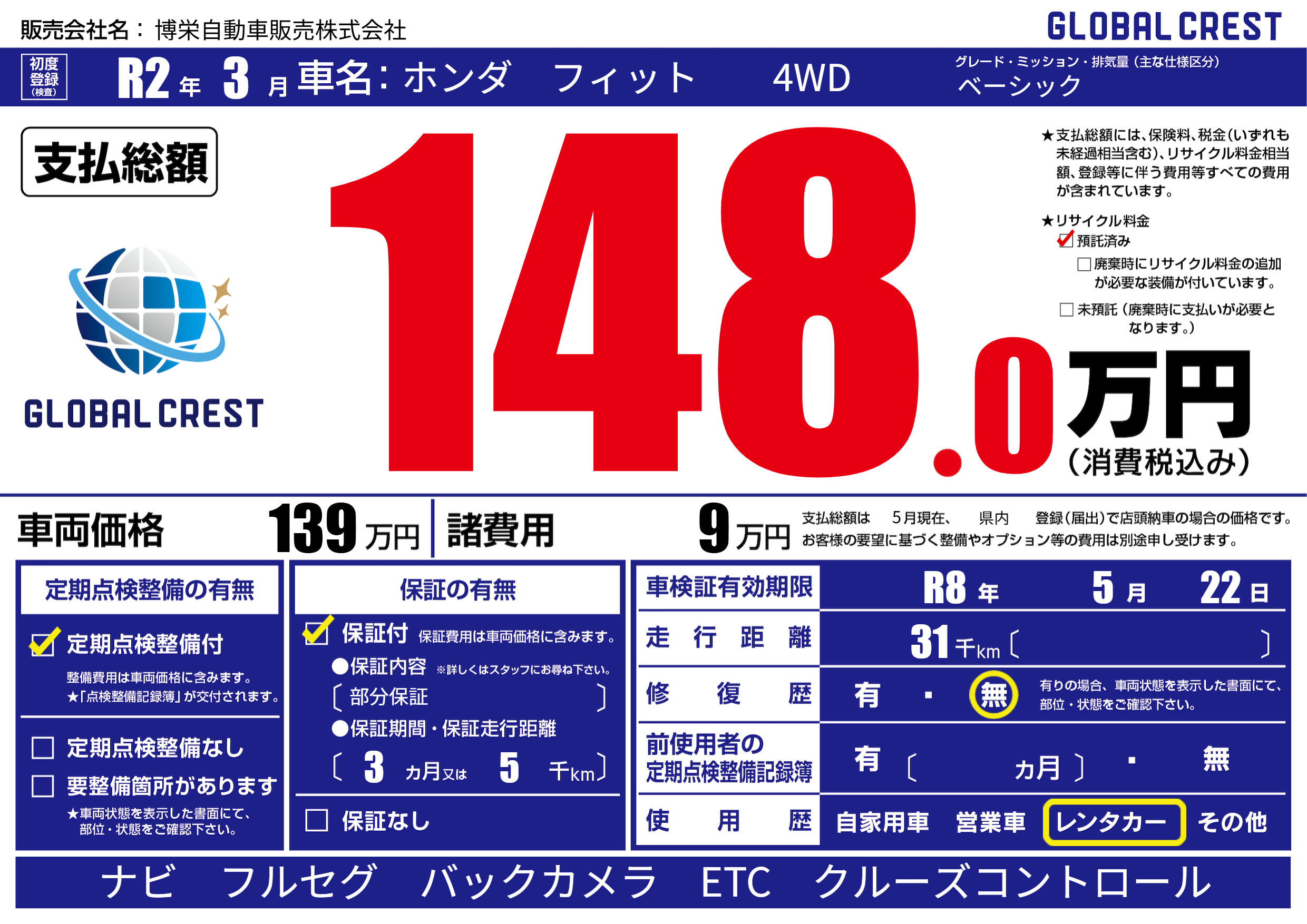 なし | 車検制限 | R8年5月22月 |