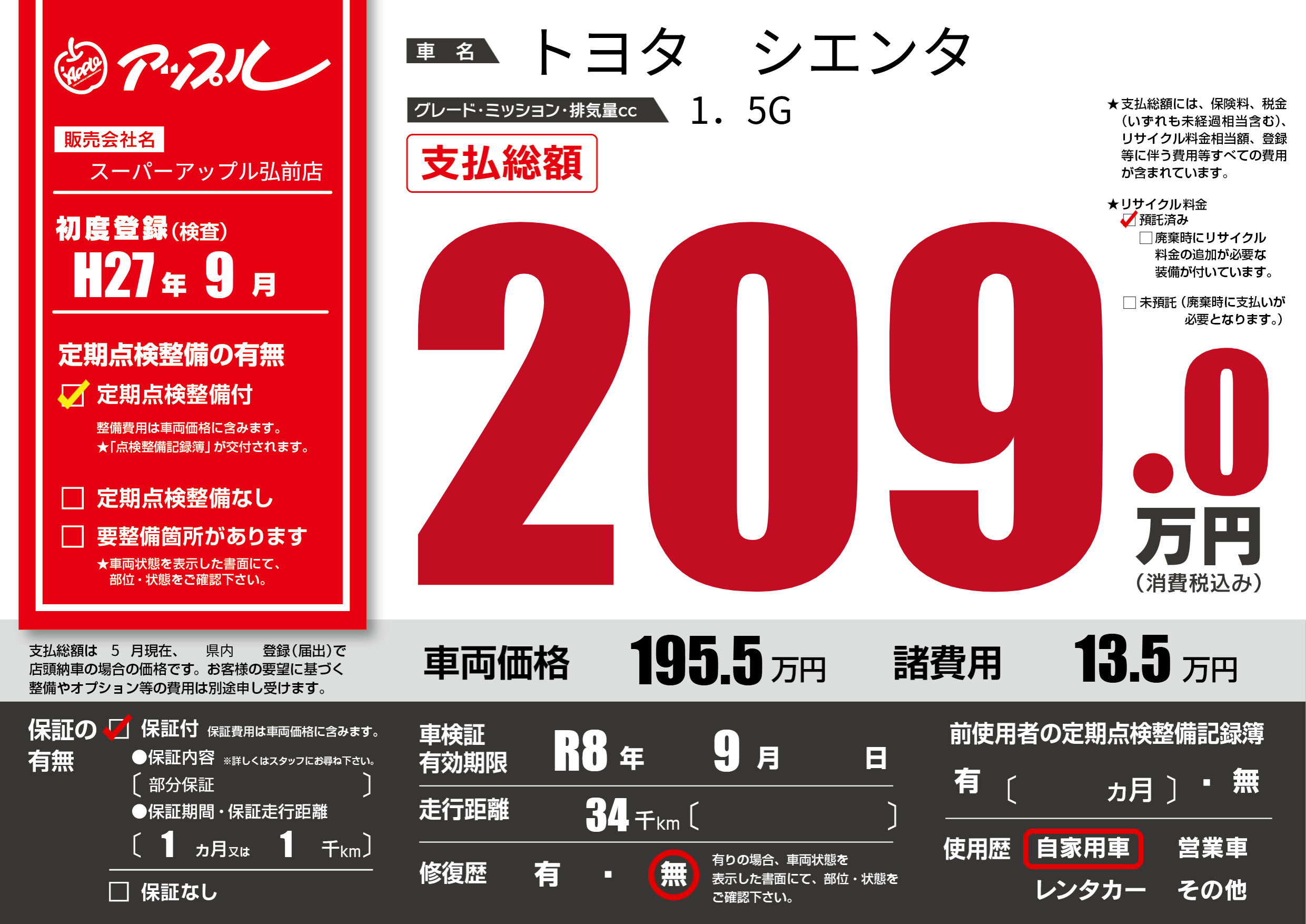 | 車名 | トヨタ シエンタ | グレード ミッション 排気量 |