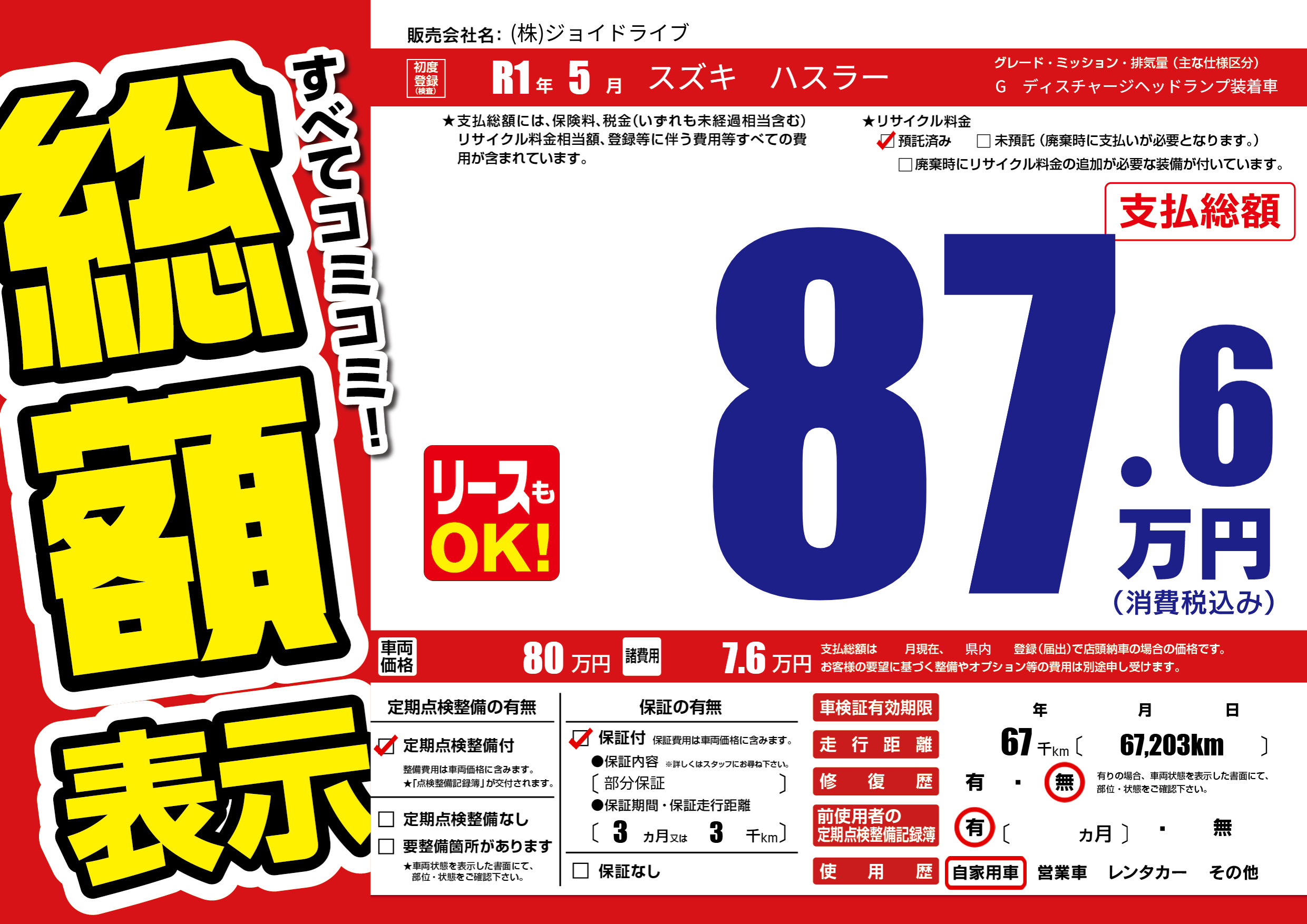 | 走行キロ | 6.7万km | 初年度登録 | R1年5月 |