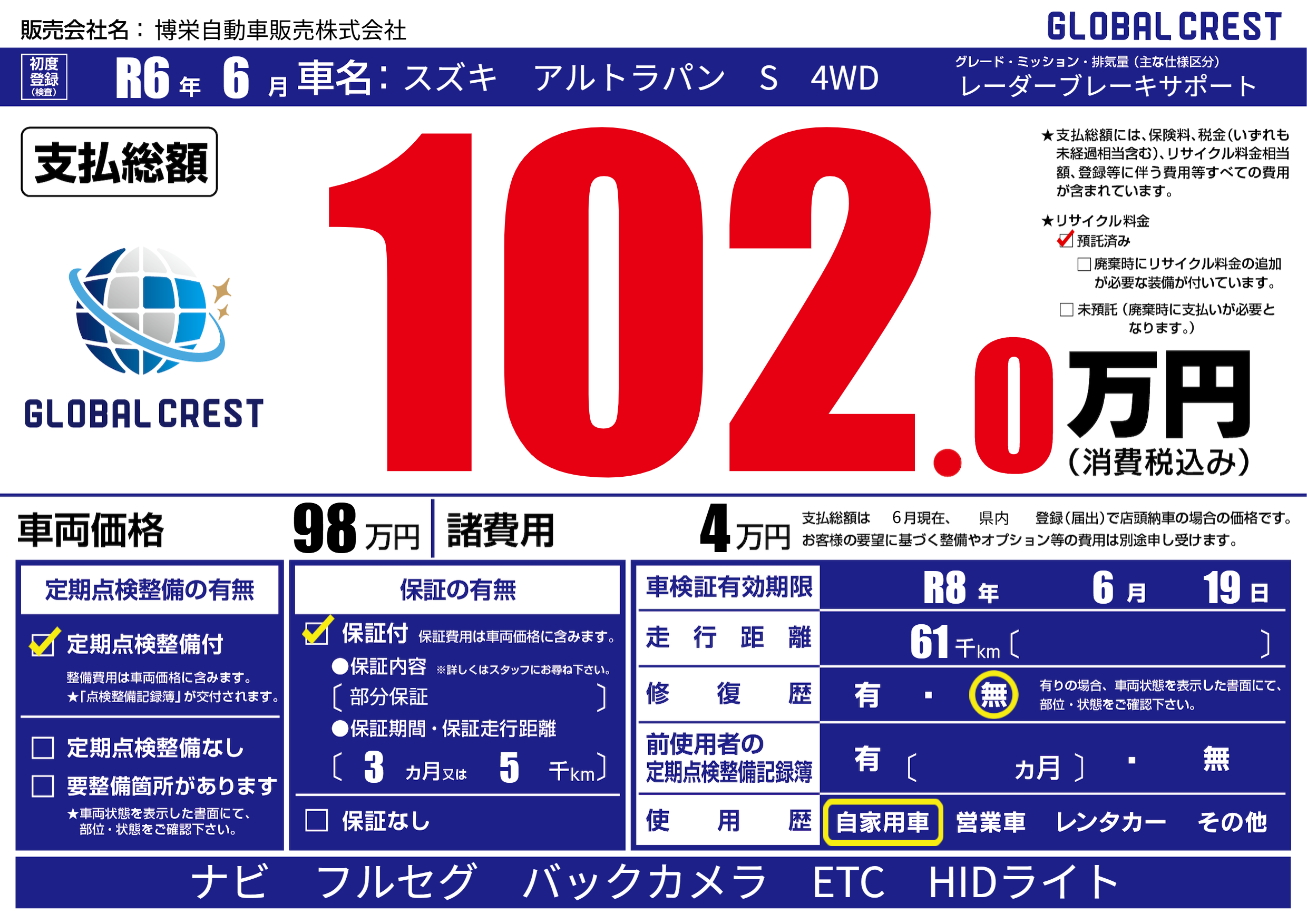| 走行キロ | 6.1万km | 初年度登録 | R6年6月 |