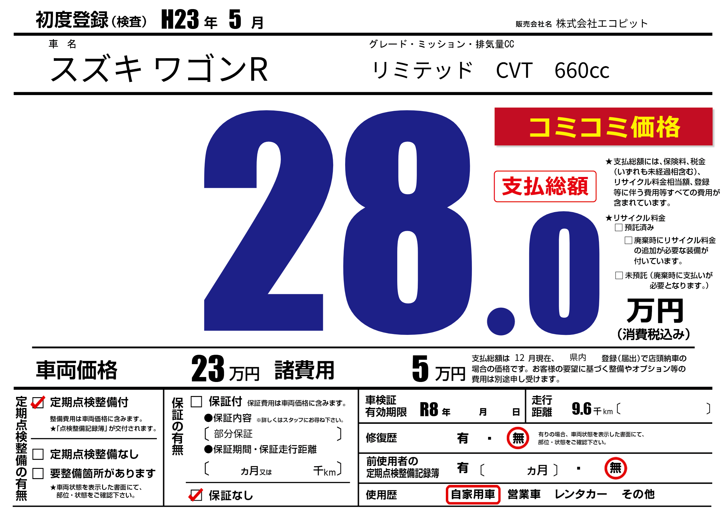 | 走行キロ | 0.9万km | 初年度登録 | H23年5月 |