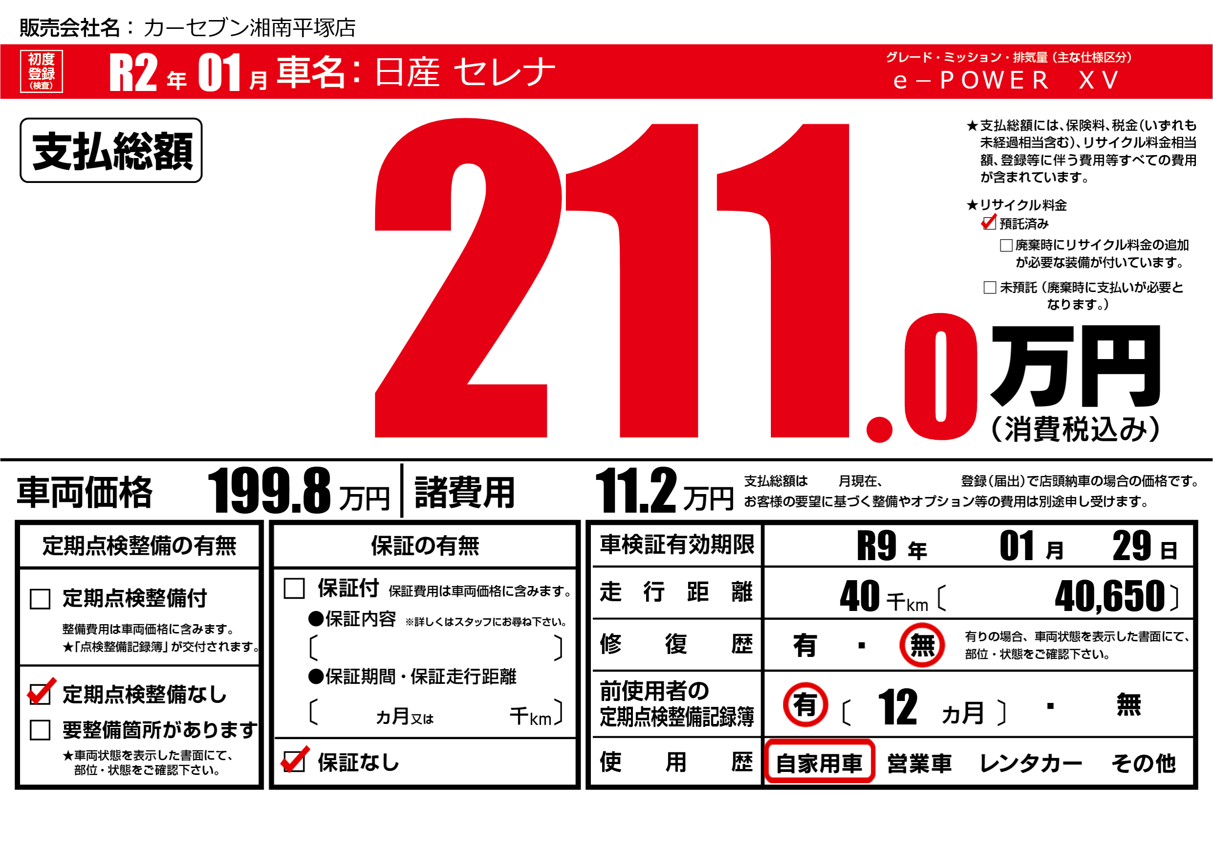 | 車名 | 日産 セレナ | グレード ミッション 排気量 |