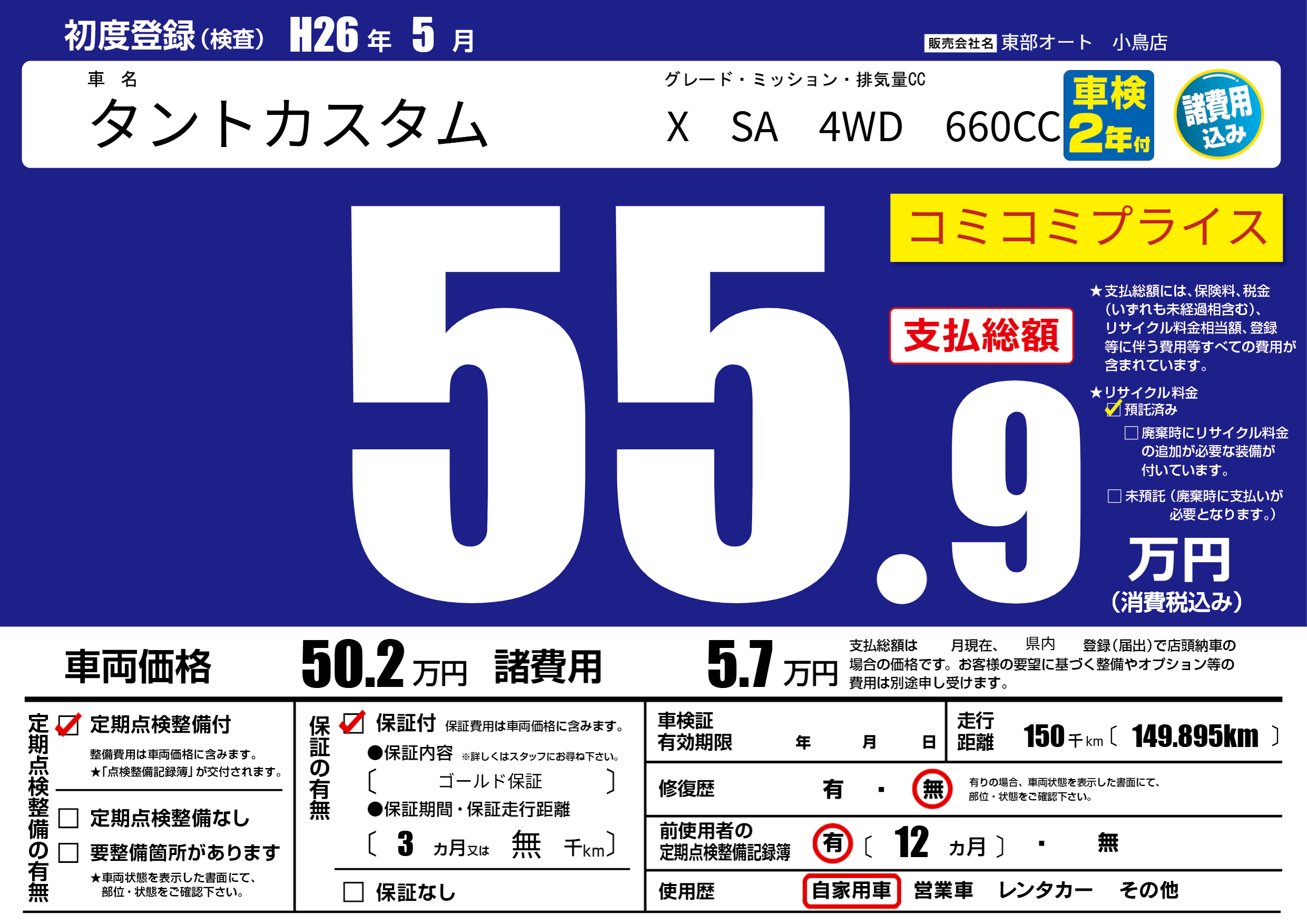 | 走行キロ | 15万km | 初年度登録 | H26年5月 |