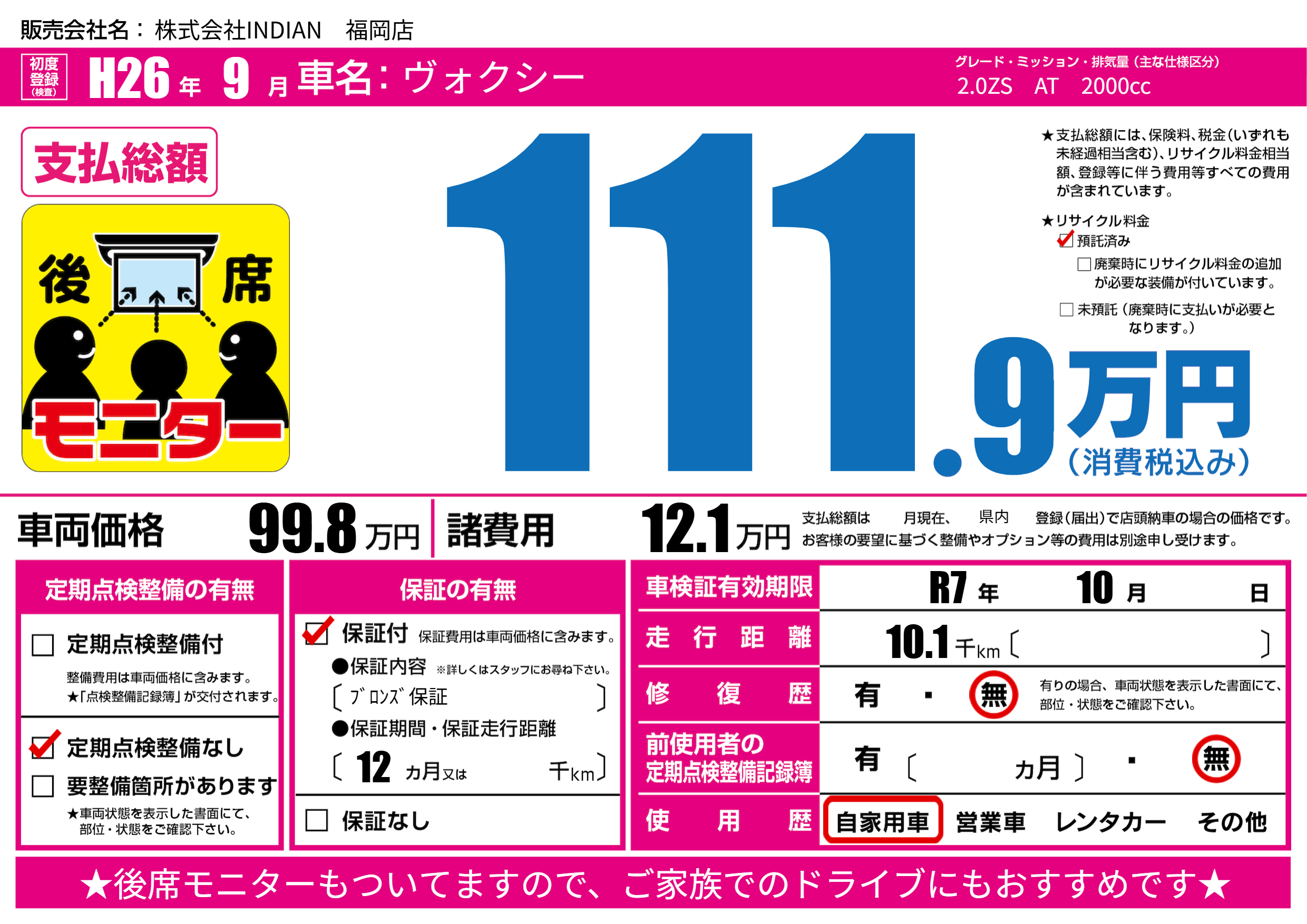 | 走行キロ | 1万km | 初年度登録 | H26年9月 |