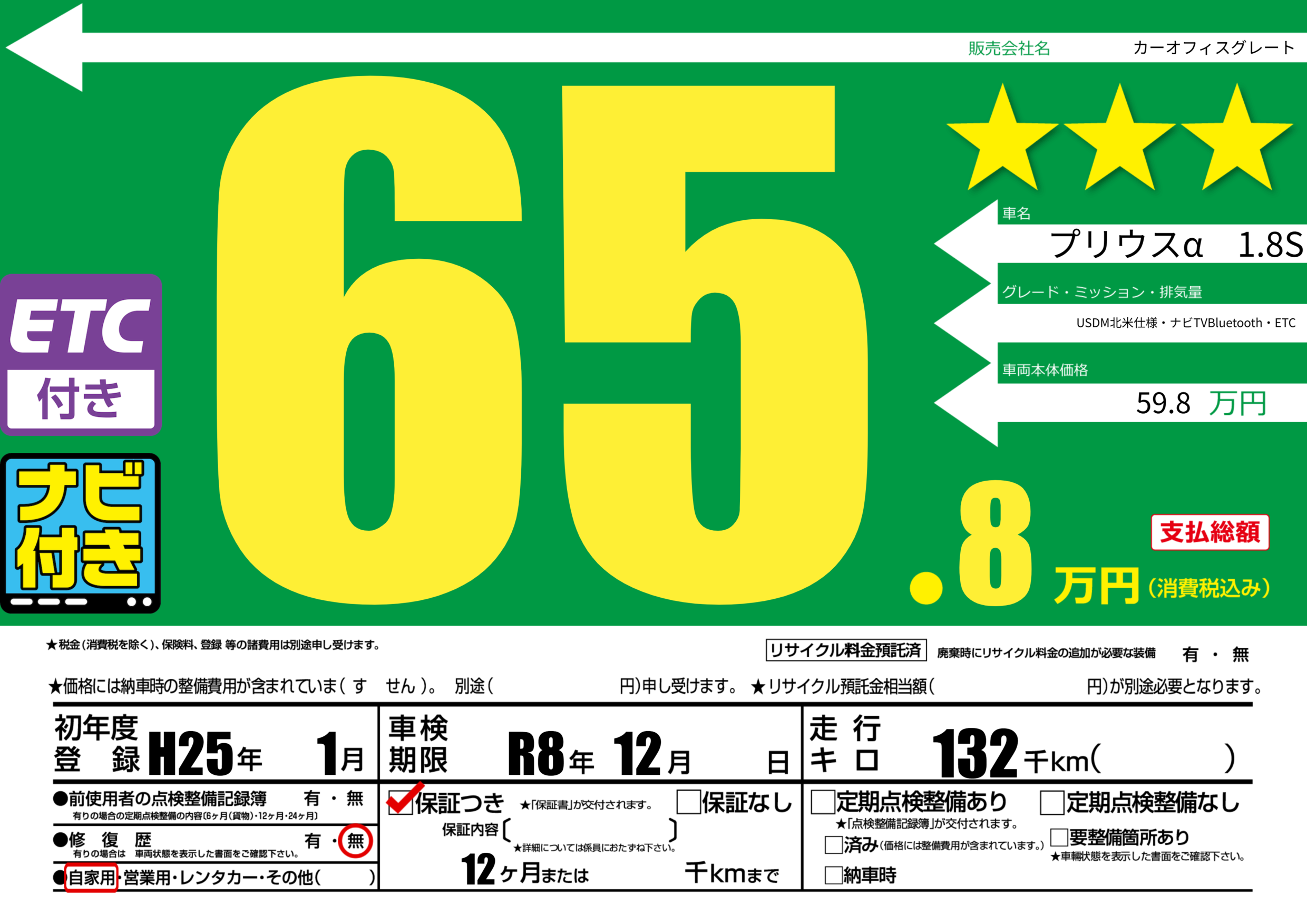| 車名 | プリウスα 1.8S | グレード ミッション 排気量 |
