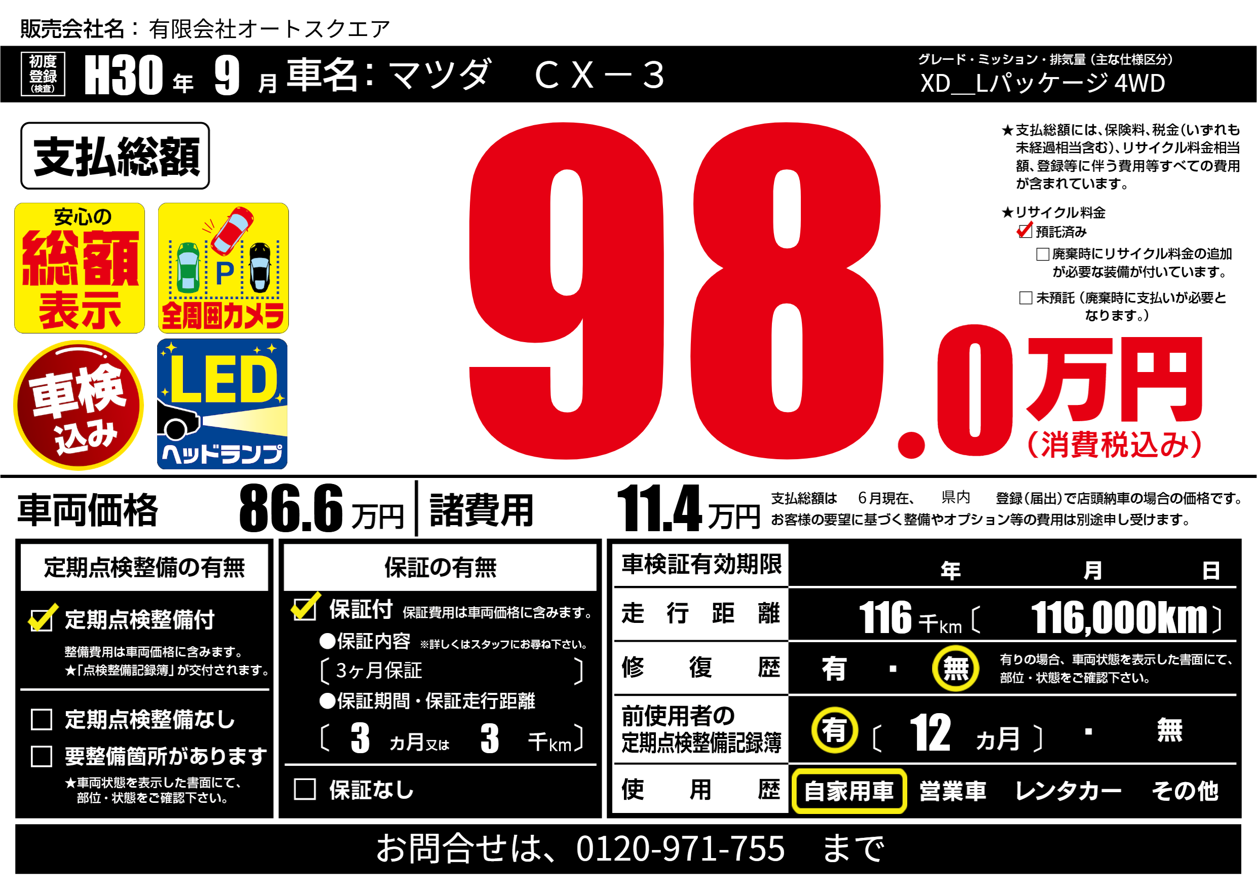保証付き 保証内容(3ヶ月保証) 3ヶ月または(3)千kmまで |