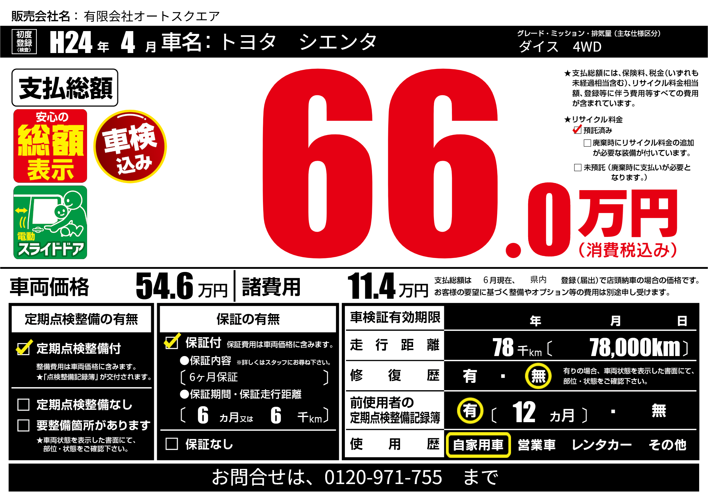 | 走行キロ | 7.8万km | 初年度登録 | H24年4月 |