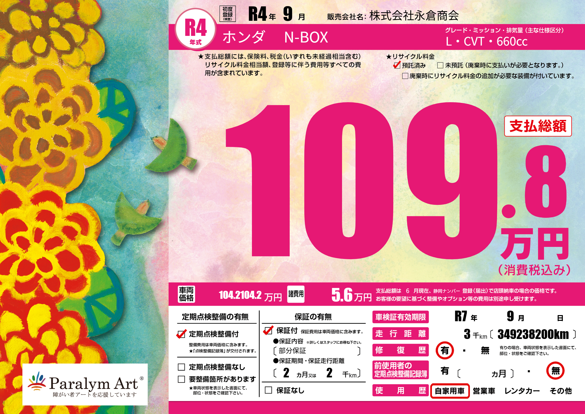 | 走行キロ | 0.3万km | 初年度登録 | R4年9月 |
