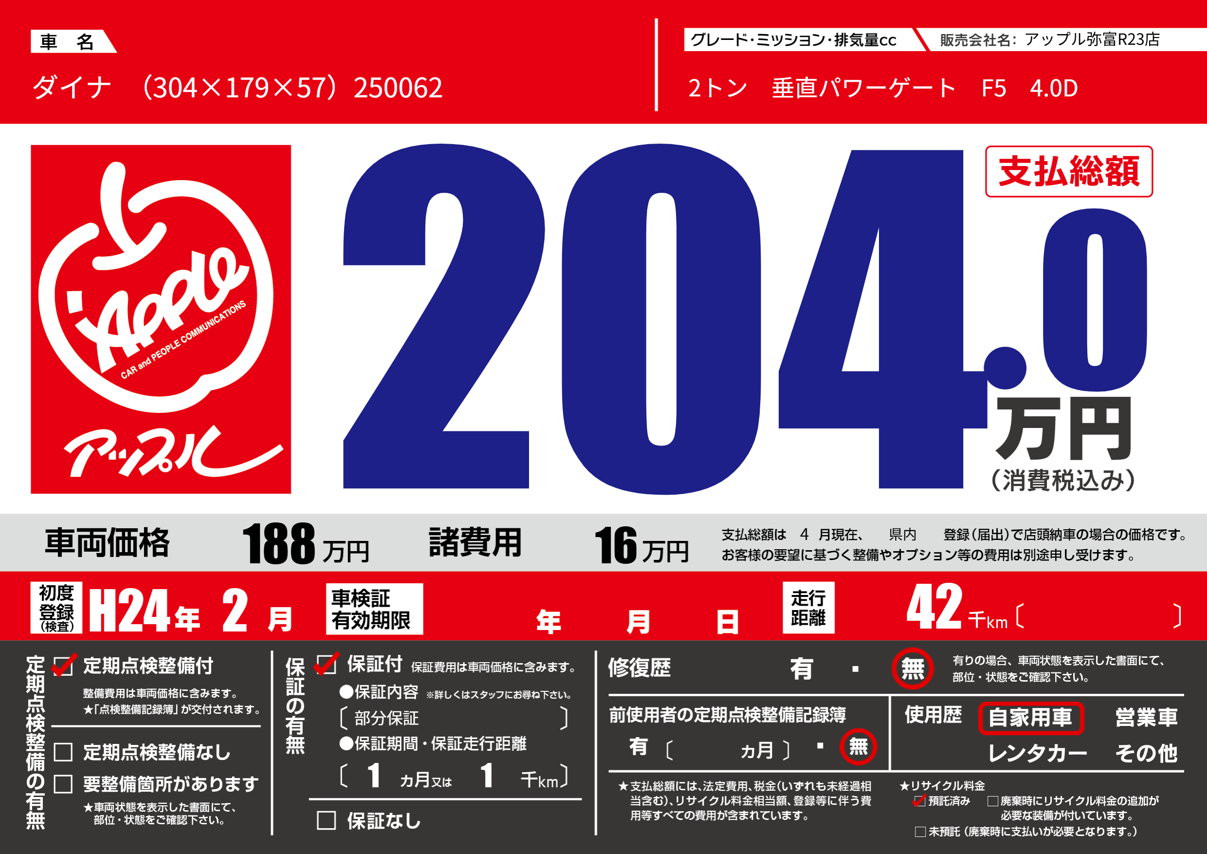 | 走行キロ | 4.2万km | 初年度登録 | H24年2月 |